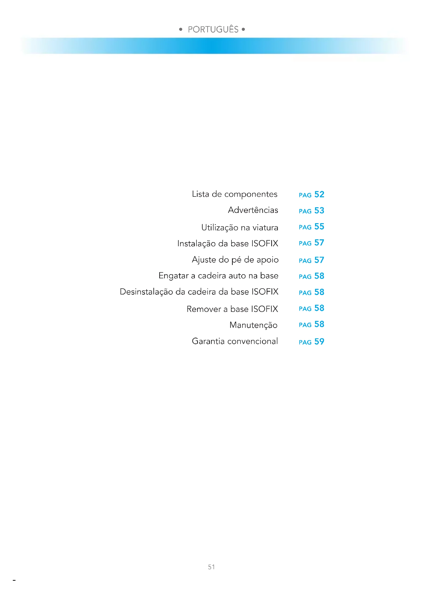 pag 52 pag 53 pag 55 pag 57 pag 57 pag 58 pag 58 pag 58 pag 58 pag 59 Lista de componentes Advertências Utilização na viatura Instalação da base ISOFIX Ajuste do pé de apoio Engatar a cadeira auto na base Desinstalação da cadeira da base ISOFIX Remover a base ISOFIX Manutenção Garantia convencional• PORTUGUÊS • • PORTUGUÊS •