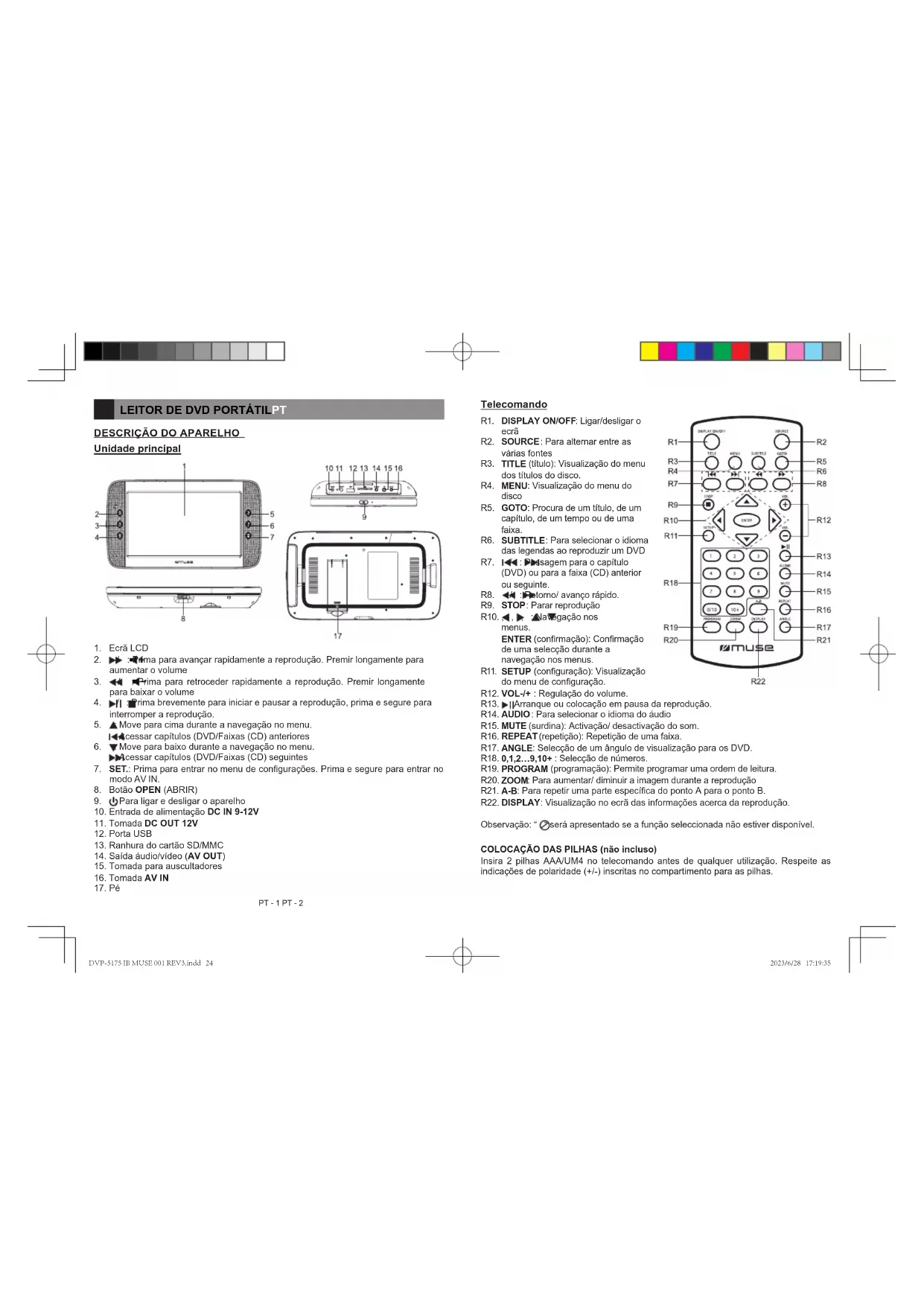 : Ligar/desligar o ecrã R2. SOURCE : Para alternar entre as várias fontes R3. TITLE (título): Visualização do menu dos títulos do disco. R4. MENU : Visualização do menu do disco R5. GOTO : Procura de um título, de um capítulo, de um tempo ou de uma faixa. R6. SUBTITLE : Para selecionar o idioma das legendas ao reproduzir um DVD R7. / : Passagem para o capítulo (DVD) ou para a faixa (CD) anterior ou seguinte. R8. / : Retorno/ avanço rápido. R9. STOP : Parar reprodução R10. , , , : Navegação nos menus. ENTER (conrmação): Conrmação de uma selecção durante a navegação nos menus. R11. SETUP (conguração): Visualização do menu de conguração. R12. VOL-/+ : Regulação do volume. R13. : Arranque ou colocação em pausa da reprodução. R14. AUDIO : Para selecionar o idioma do áudio R15. MUTE (surdina): Activação/ desactivação do som. R16. REPEAT (repetição): Repetição de uma faixa. R17. ANGLE : Selecção de um ângulo de visualização para os DVD. R18. 0,1,2…9,10+ : Selecção de números. R19. PROGRAM (programação): Permite programar uma ordem de leitura. R20. ZOOM : Para aumentar/ diminuir a imagem durante a reprodução R21. A-B : Para repetir uma parte especíca do ponto A para o ponto B. R22. DISPLAY : Visualização no ecrã das informações acerca da reprodução. Observação: “ “ será apresentado se a função seleccionada não estiver disponível. COLOCAÇÃO DAS PILHAS (não incluso) Insira 2 pilhas AAA/UM4 no telecomando antes de qualquer utilização. Respeite as indicações de polaridade (+/-) inscritas no compartimento para as pilhas. Telecomando DVP-5175 IB MUSE 001 REV3.indd 24DVP-5175 IB MUSE 001 REV3.indd 24 2023/6/28 17:19:352023/6/28 17:19:35PT - 3 PT - 4 ACESSÓRIOS ALIMENTAÇÃO Adaptador de corrente x1 Adaptador de isqueiro x1 Cabo DC-AV x1 Suporte de instalação x1 Telecomando x1 Atenção: