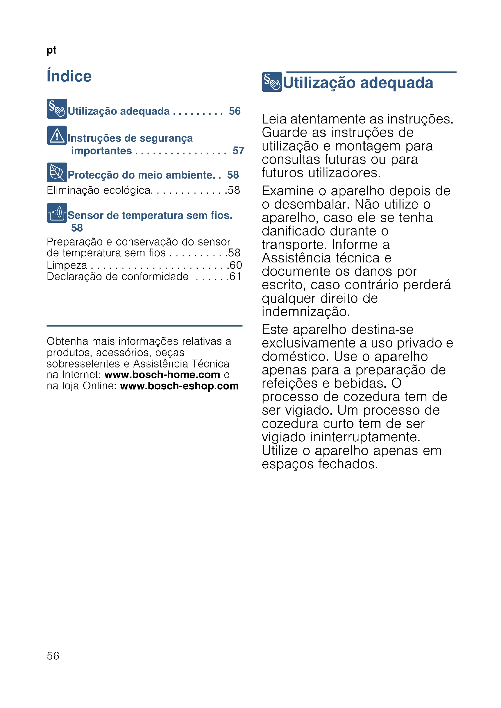 - Índice ptI nst r uç ões de servi ço 8 Utilização adequada p. 56