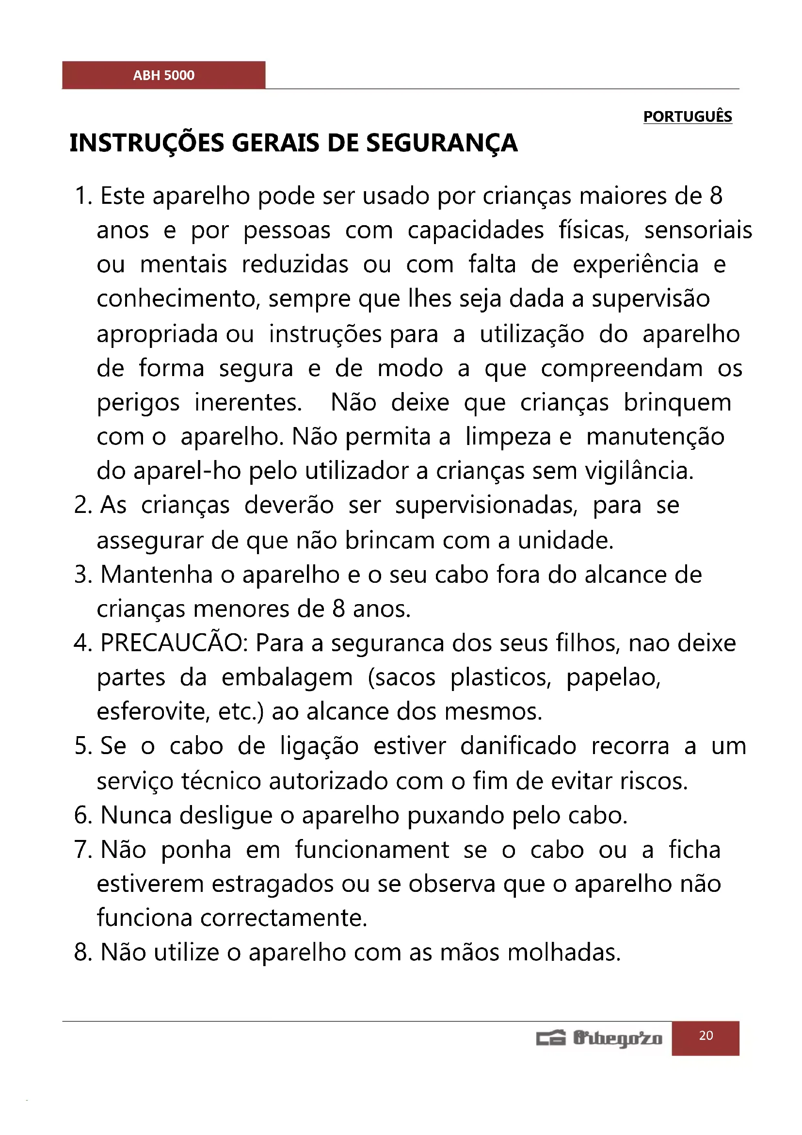 8. Não utilize o aparelho com as mãos molhadas.ABH 5000