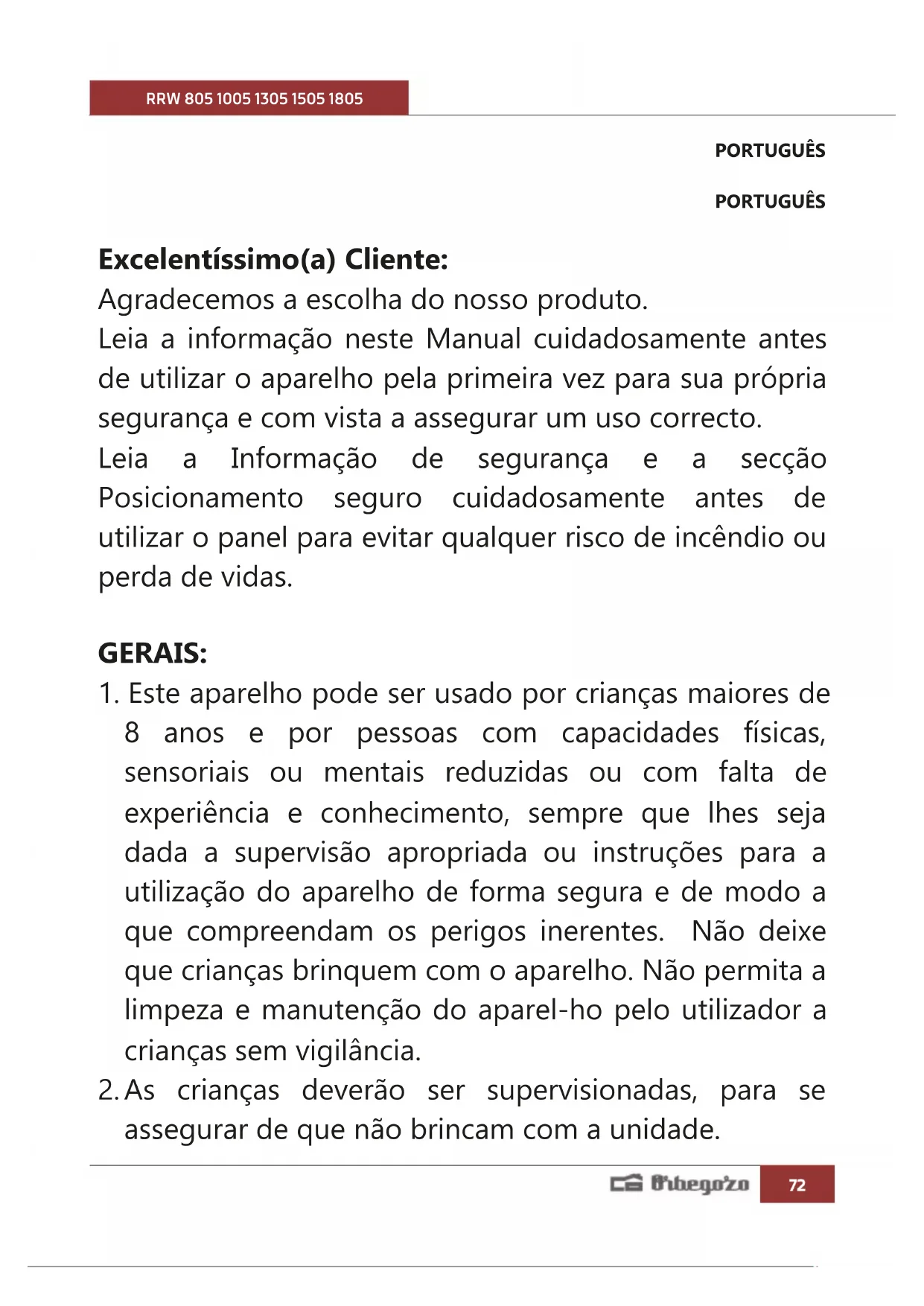 PRECAUÇÕES IMPORTANTES: O significado da figura é “NÃO TAPAR”. AVISO: Não tape o aquecedor para impedir uma situação de sobreaquecimento. Crianças menores de 3 anos deve ser mantido fora do alcance do aparelho, a menos que constantemente supervisionado. Crianças de 3 anos e menos de 8 anos de idade só deve ligar / desligar o dispositivo que tenha sido colocado ou instalado em sua posição normal de operação e desde que sejam supervisionadas ou foram instruídos sobre o uso do dispositivo de forma segura e compreender os riscos de que o dispositivo tem. Crianças de 3 anos ou menos 8 não deve ser conectado regular e limpar o aparelho ou realizar manutenção. CUIDADO: Algumas partes deste aparelho podem ficar quentes e causar queimaduras. Cuidados devem ser tomados especialmente em crianças e pessoas vulneráveis estão presentes. O dispositivo não deve ser colocado imediatamente abaixo de um cálice. Não coloque um aquecedor em uso perto de cortinas, móveis, painéis de madeira ou material combustível que pode se deteriorar com o calor.RRW 805 1005 1305 1505 1805