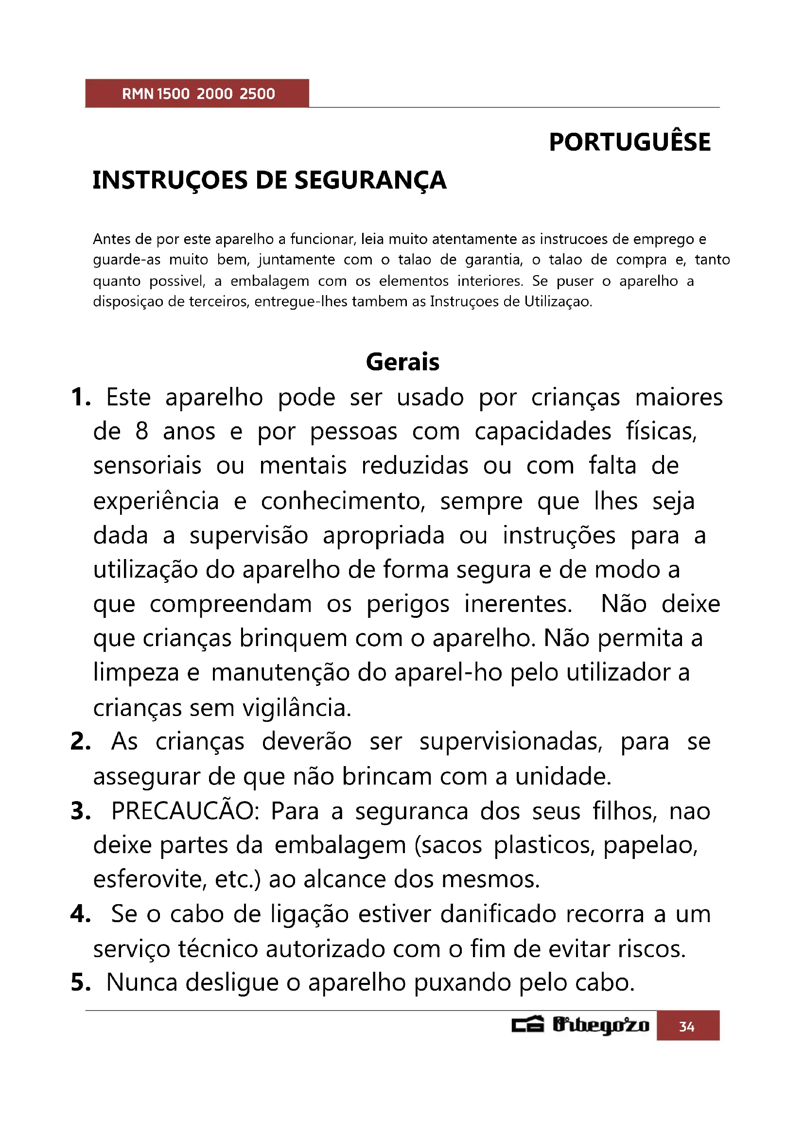 5. Nunca desligue o aparelho puxando pelo cabo.RMN 1500 2000 2500