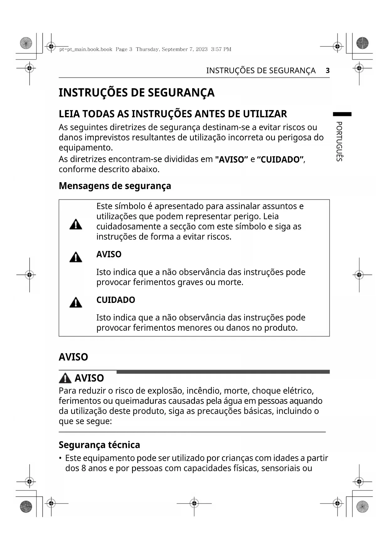 - Este equipamento pode ser utilizado por crianças com idades a partir dos 8 anos e por pessoas com capacidades físicas, sensoriais ou Este símbolo é apresentado para assinalar assuntos e utilizações que podem representar perigo. Leia cuidadosamente a secção com este símbolo e siga as instruções de forma a evitar riscos. AVISO Isto indica que a não observância das instruções pode provocar ferimentos graves ou morte. CUIDADO Isto indica que a não observância das instruções pode provocar ferimentos menores ou danos no produto. pt-pt_main.book.book Page 3 Thursday, September 7, 2023 3:57 PM4