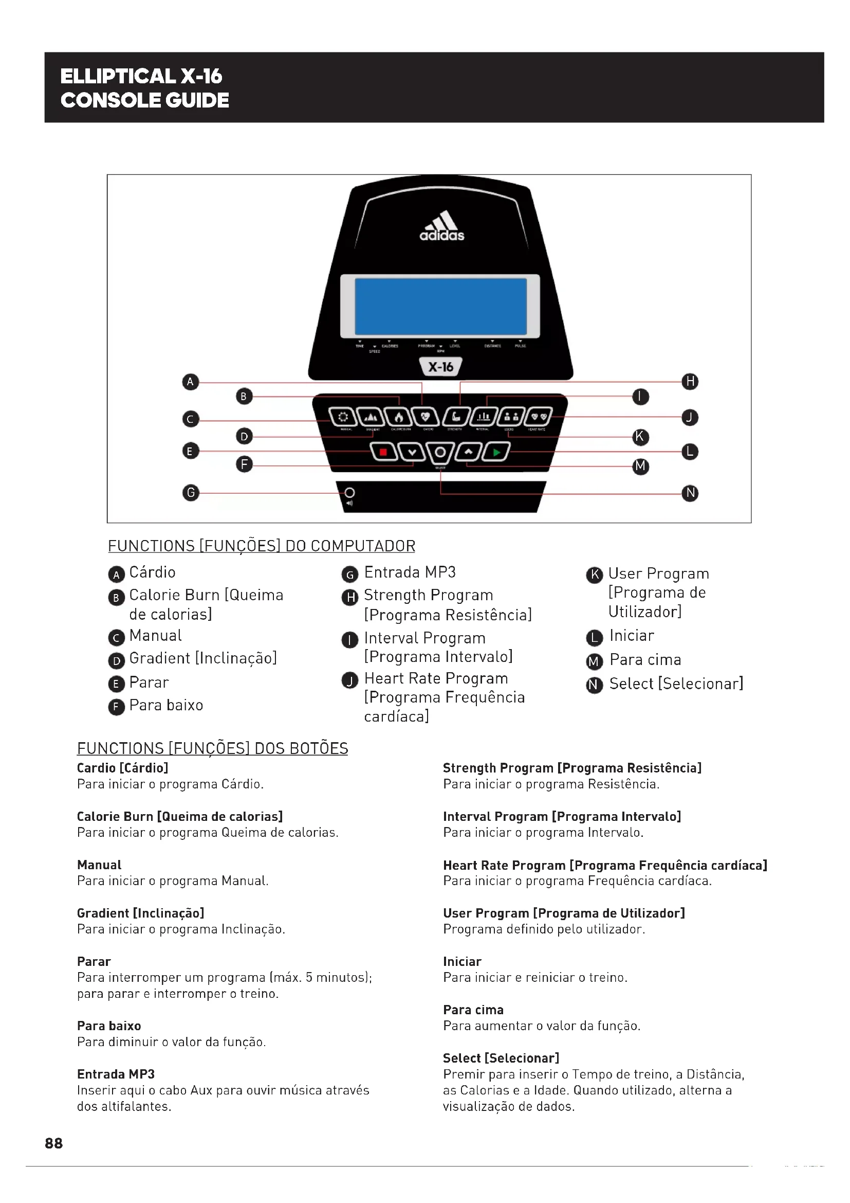 Select [Selecionar] Cardio [Cárdio] Para iniciar o programa Cárdio. Calorie Burn [Queima de calorias] Para iniciar o programa Queima de calorias. Manual Para iniciar o programa Manual. Gradient [Inclinação] Para iniciar o programa Inclinação. Parar Para interromper um programa (máx. 5 minutos); para parar e interromper o treino. Para baixo Para diminuir o valor da função. Entrada MP3 Inserir aqui o cabo Aux para ouvir música através dos altifalantes. Strength Program [Programa Resistência] Para iniciar o programa Resistência. Interval Program [Programa Intervalo] Para iniciar o programa Intervalo. Heart Rate Program [Programa Frequência cardíaca] Para iniciar o programa Frequência cardíaca. User Program [Programa de Utilizador] Programa denido pelo utilizador. Iniciar Para iniciar e reiniciar o treino. Para cima Para aumentar o valor da função. Select [Selecionar] Premir para inserir o Tempo de treino, a Distância, as Calorias e a Idade. Quando utilizado, alterna a visualização de dados.ADIDASHARDWARE.COM FUNCIONAMENTO Quando a fonte de alimentação é ligada à máquina, isso fará ligar o computador que emitirá um som. Todos os elementos do ecrã LCD acenderão durante 2 segundos. Em seguida, uma matriz de pontos apresentará a versão do software da consola. Depois, a consola apresentará a leitura do odómetro, o tempo total (em horas) à esquerda e a distância virtual à direita.