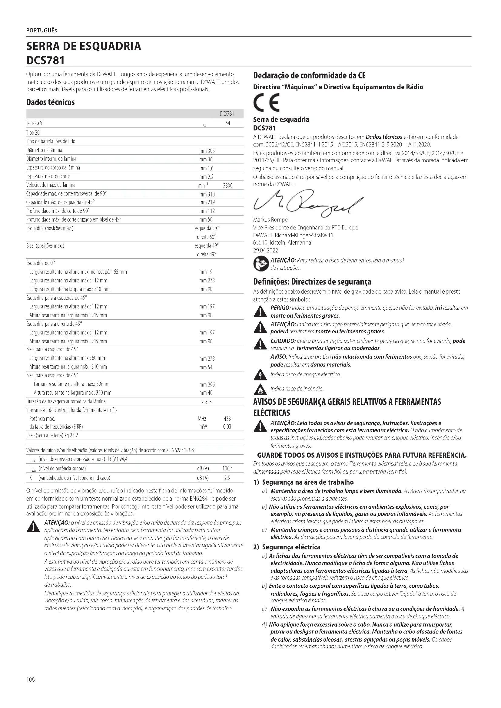 ATENÇÃO: o nível de emissão de vibração e/ou ruído declarado diz respeito às principais aplicações da ferramenta. No entanto, se a ferramenta for utilizada para outras aplicações ou com outros acessórios ou se a manutenção for insuficiente, o nível de emissão de vibração e/ou ruído pode ser diferente. Isto pode aumentar significativamente o nível de exposição às vibrações ao longo do período total detrabalho. A estimativa do nível de vibração e/ou ruído deve ter também em conta o número de vezes que a ferramenta é desligada ou está em funcionamento, mas sem executar tarefas. Isto pode reduzir significativamente o nível de exposição ao longo do período total detrabalho. Identifique as medidas de segurança adicionais para proteger o utilizador dos efeitos da vibração e/ou ruído, tais como: manutenção da ferramenta e dos acessórios, manter as mãos quentes (relacionado com a vibração), e organização dos padrões detrabalho. Declaração de conformidade da CE Directiva “Máquinas” e Directiva Equipamentos de Rádio Serra de esquadria DCS781 A DeWALT declara que os produtos descritos em Dados técnicos estão em conformidade com: 2006/42/CE, EN62841‑1:2015 +AC:2015; EN62841‑3‑9:2020 + A11:2020. Estes produtos estão também em conformidade com a directiva 2014/53/UE; 2014/30/UE e 2011/65/UE. Para obter mais informações, contacte a DeWALT através da morada indicada em seguida ou consulte o verso domanual. O abaixo assinado é responsável pela compilação do ficheiro técnico e faz esta declaração em nome daDeWALT. Markus Rompel Vice‑Presidente de Engenharia da PTE‑Europe DeWALT, Richard‑Klinger‑Straße 11, 65510, Idstein, Alemanha