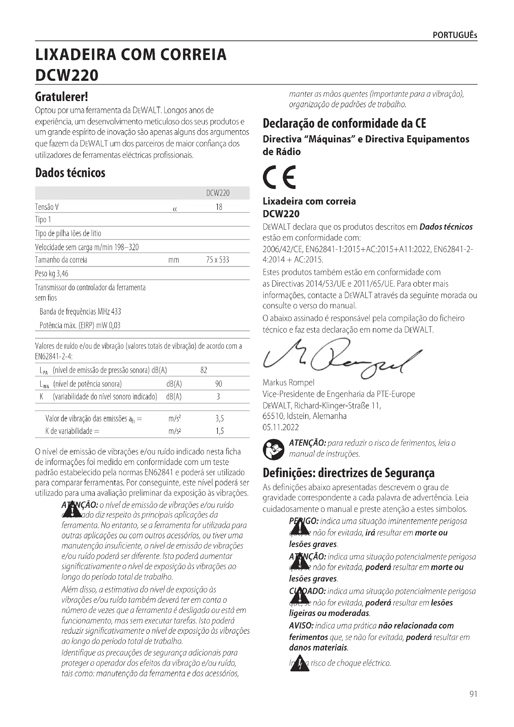 merinformasjon.91 PORTUGUês ATENÇÃO: para reduzir o risco de ferimentos, leia o manual deinstruções. Definições: directrizes de Segurança As definições abaixo apresentadas descrevem o grau de gravidade correspondente a cada palavra de advertência. Leia cuidadosamente o manual e preste atenção a estessímbolos. PERIGO: indica uma situação iminentemente perigosa que, se não for evitada, irá resultar em morte ou lesõesgraves. ATENÇÃO: indica uma situação potencialmente perigosa que, se não for evitada, poderá resultar em morte ou lesõesgraves. CUIDADO: indica uma situação potencialmente perigosa que, se não for evitada, poderá resultar em lesões ligeiras oumoderadas. AVISO: indica uma prática não relacionada com ferimentos que, se não for evitada, poderá resultar em danosmateriais. Indica risco de choqueeléctrico. Declaração de conformidade da CE Directiva “Máquinas” e Directiva Equipamentos de Rádio Lixadeira com correia DCW220 DeWALT declara que os produtos descritos em Dados técnicos estão em conformidade com: 2006/42/CE, EN62841‑1:2015+AC:2015+A11:2022, EN62841‑2‑4:2014 + AC:2015.Estes produtos também estão em conformidade com as Directivas 2014/53/UE e 2011/65/UE. Para obter mais informações, contacte a DeWALT através da seguinte morada ou consulte o verso domanual.O abaixo assinado é responsável pela compilação do ficheiro técnico e faz esta declaração em nome daDeWALT.Markus Rompel Vice‑Presidente de Engenharia da PTE‑Europe DeWALT, Richard‑Klinger‑Straße 11, 65510, Idstein, Alemanha 05.11.2022manter as mãos quentes (importante para a vibração), organização de padrões detrabalho.O nível de emissão de vibrações e/ou ruído indicado nesta ficha de informações foi medido em conformidade com um teste padrão estabelecido pela normas EN62841 e poderá ser utilizado para comparar ferramentas. Por conseguinte, este nível poderá ser utilizado para uma avaliação preliminar da exposição àsvibrações. ATENÇÃO: o nível de emissão de vibrações e/ou ruído declarado diz respeito às principais aplicações da ferramenta. No entanto, se a ferramenta for utilizada para outras aplicações ou com outros acessórios, ou tiver uma manutenção insuficiente, o nível de emissão de vibrações e/ou ruído poderá ser diferente. Isto poderá aumentar significativamente o nível de exposição às vibrações ao longo do período total detrabalho.Além disso, a estimativa do nível de exposição às vibrações e/ou ruído também deverá ter em conta o número de vezes que a ferramenta é desligada ou está em funcionamento, mas sem executar tarefas. Isto poderá reduzir significativamente o nível de exposição às vibrações ao longo do período total detrabalho.Identifique as precauções de segurança adicionais para proteger o operador dos efeitos da vibração e/ou ruído, tais como: manutenção da ferramenta e dos acessórios, DCW220Tensão V