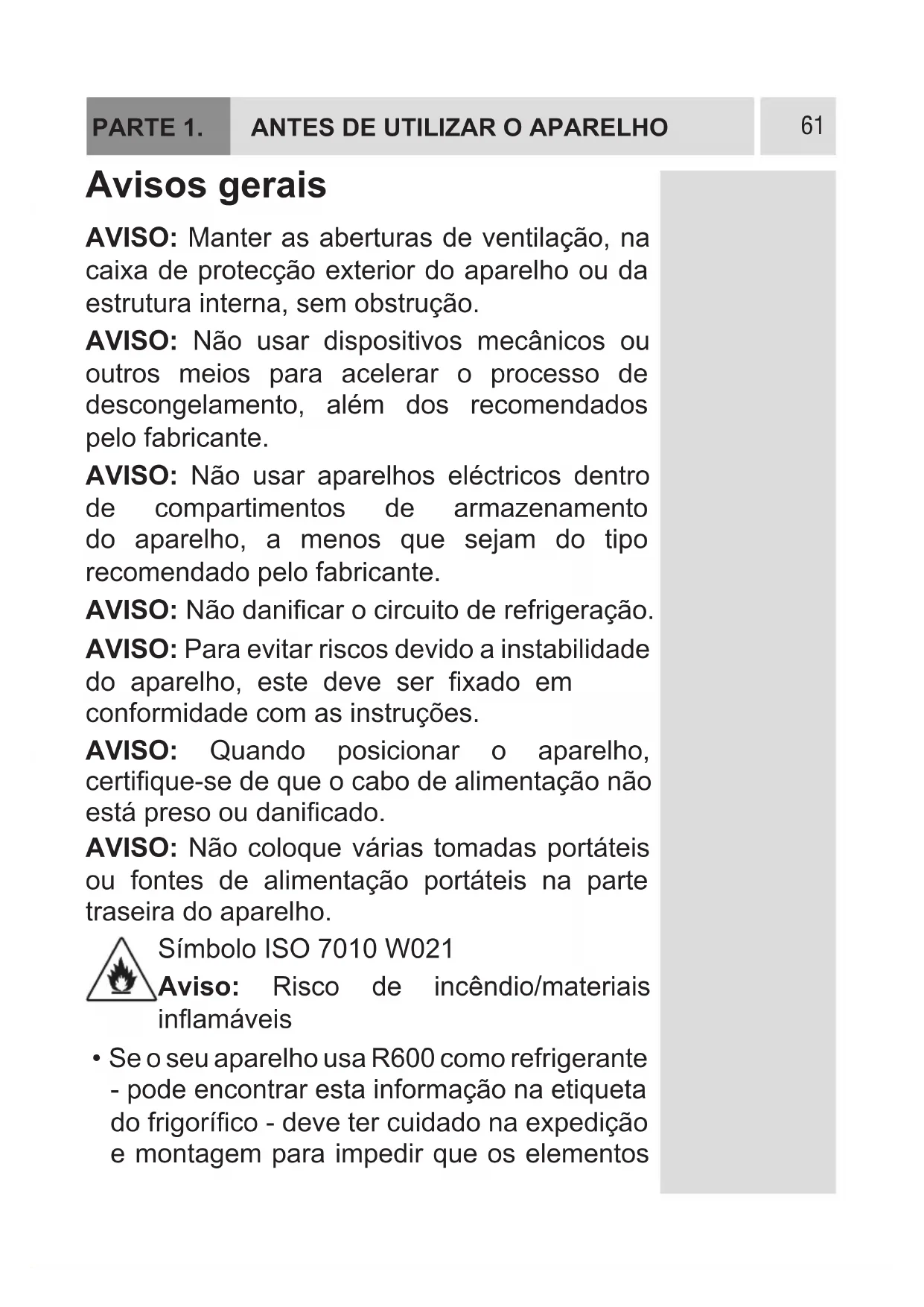 As instruções de funcionamento aplicam-se a vários modelos. No entanto podem existir algumas diferenças.61 Avisos gerais AVISO: Manter as aberturas de ventilação, na caixa de protecção exterior do aparelho ou da estrutura interna, sem obstrução. AVISO: Não usar dispositivos mecânicos ou outros meios para acelerar o processo de descongelamento, além dos recomendados pelo fabricante. AVISO: Não usar aparelhos eléctricos dentro de compartimentos de armazenamento do aparelho, a menos que sejam do tipo recomendado pelo fabricante. AVISO: Não danicar o circuito de refrigeração. AVISO: Para evitar riscos devido a instabilidade do aparelho, este deve ser xado em conformidade com as instruções. AVISO: Quando posicionar o aparelho, certique-se de que o cabo de alimentação não está preso ou danicado. AVISO: Não coloque várias tomadas portáteis ou fontes de alimentação portáteis na parte traseira do aparelho. Símbolo ISO 7010 W021 Aviso: Risco de incêndio/materiais inamáveis