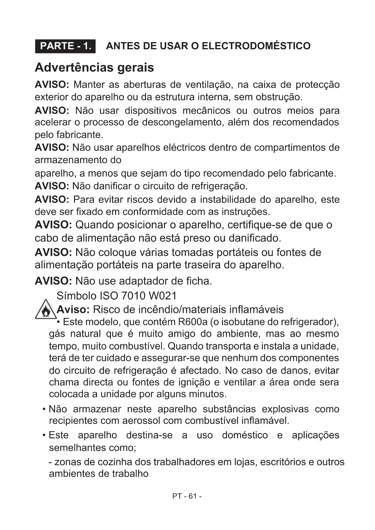 - AS PARTES DO FRIGORÍFICO E SEUS COMPARTIMENTOS PT - 61 - Advertências gerais AVISO: Manter as aberturas de ventilação, na caixa de protecção exterior do aparelho ou da estrutura interna, sem obstrução. AVISO: Não usar dispositivos mecânicos ou outros meios para acelerar o processo de descongelamento, além dos recomendados pelo fabricante. AVISO: Não usar aparelhos eléctricos dentro de compartimentos de armazenamento do aparelho, a menos que sejam do tipo recomendado pelo fabricante. AVISO: Não danicar o circuito de refrigeração. AVISO: Para evitar riscos devido a instabilidade do aparelho, este deve ser xado em conformidade com as instruções. AVISO: Quando posicionar o aparelho, certique-se de que o cabo de alimentação não está preso ou danicado. AVISO: Não coloque várias tomadas portáteis ou fontes de alimentação portáteis na parte traseira do aparelho. AVISO: Não use adaptador de cha. Símbolo ISO 7010 W021 Aviso: Risco de incêndio/materiais inamáveis p. 78