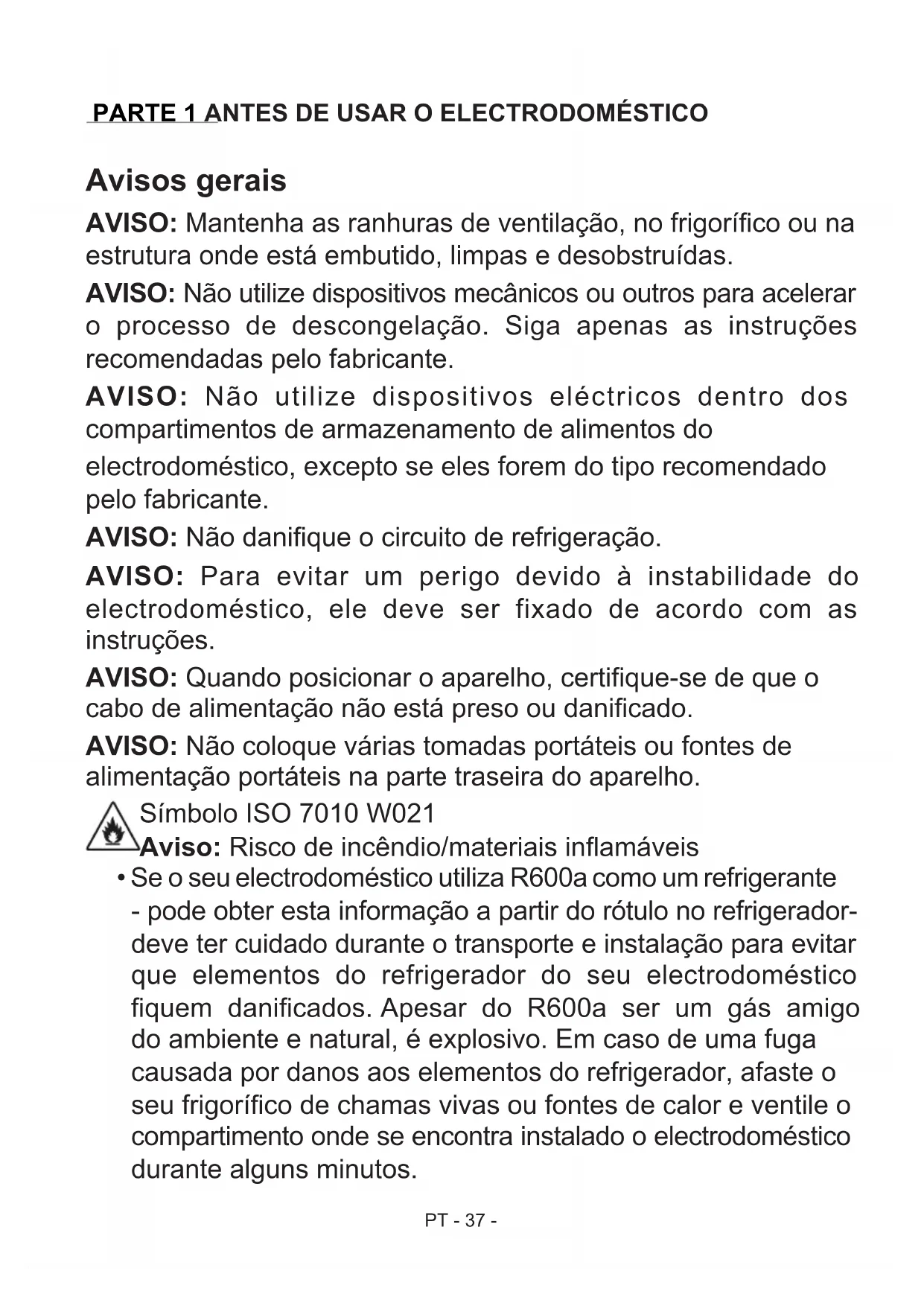 -As instruções de funcionamento aplicam-se a diversos electrodomésticos. Pode haver diferenças. Não use adaptador de cha.PT - 37 - Avisos gerais AVISO: Mantenha as ranhuras de ventilação, no frigoríco ou na estrutura onde está embutido, limpas e desobstruídas. AVISO: Não utilize dispositivos mecânicos ou outros para acelerar o processo de descongelação. Siga apenas as instruções recomendadas pelo fabricante. AVISO: Não utilize dispositivos eléctricos dentro dos compartimentos de armazenamento de alimentos do electrodoméstico, excepto se eles forem do tipo recomendado pelo fabricante. AVISO: Não danique o circuito de refrigeração. AVISO: Para evitar um perigo devido à instabilidade do electrodoméstico, ele deve ser fixado de acordo com as instruções. AVISO: Quando posicionar o aparelho, certique-se de que o cabo de alimentação não está preso ou danicado. AVISO: Não coloque várias tomadas portáteis ou fontes de alimentação portáteis na parte traseira do aparelho. Símbolo ISO 7010 W021 Aviso: Risco de incêndio/materiais inamáveis