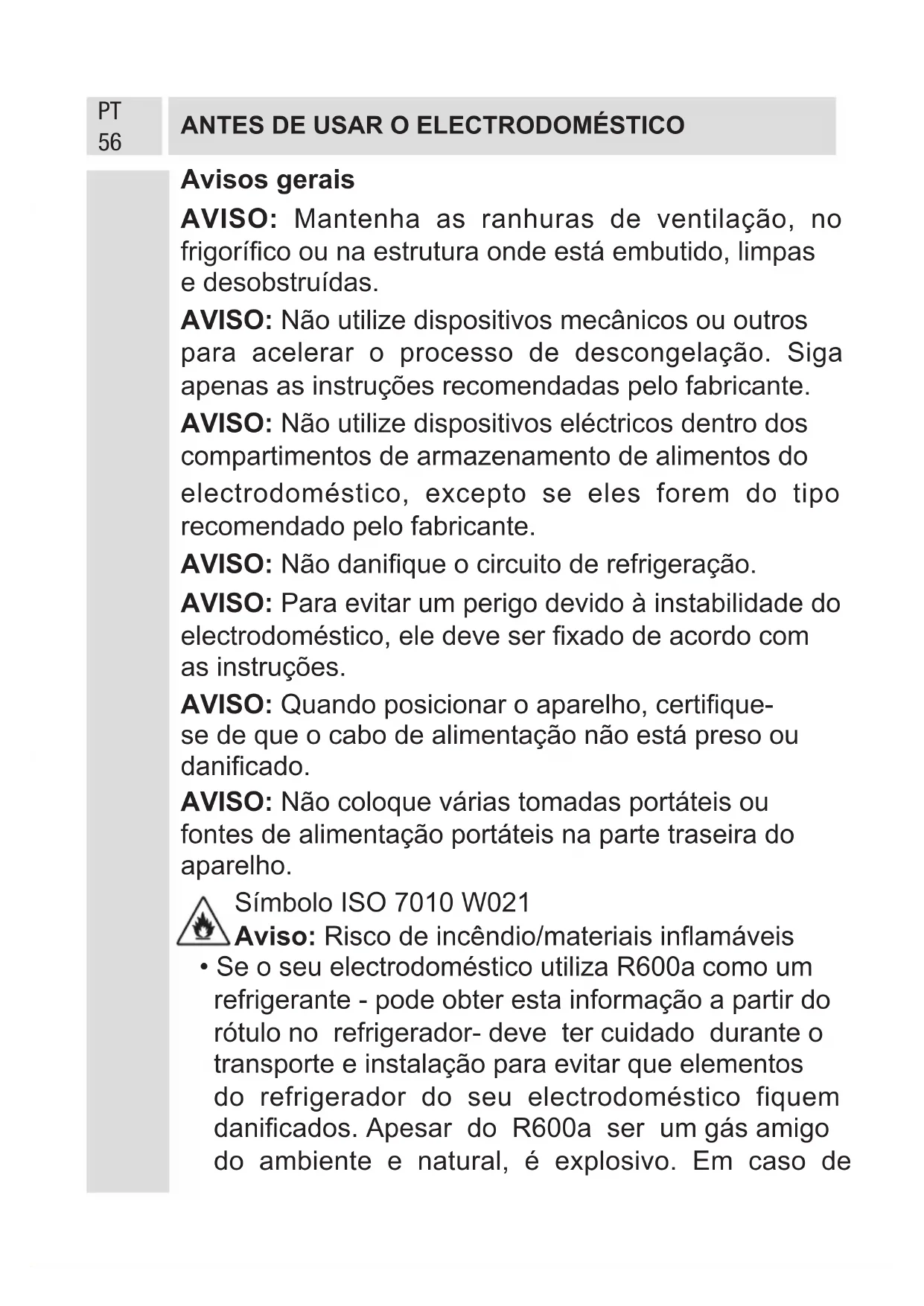 Avisos gerais AVISO: Mantenha as ranhuras de ventilação, no frigoríco ou na estrutura onde está embutido, limpas e desobstruídas. AVISO: Não utilize dispositivos mecânicos ou outros para acelerar o processo de descongelação. Siga apenas as instruções recomendadas pelo fabricante. AVISO: Não utilize dispositivos eléctricos dentro dos compartimentos de armazenamento de alimentos do electrodoméstico, excepto se eles forem do tipo recomendado pelo fabricante. AVISO: Não danique o circuito de refrigeração. AVISO: Para evitar um perigo devido à instabilidade do electrodoméstico, ele deve ser xado de acordo com as instruções. AVISO: Quando posicionar o aparelho, certique- se de que o cabo de alimentação não está preso ou danicado. AVISO: Não coloque várias tomadas portáteis ou fontes de alimentação portáteis na parte traseira do aparelho. Símbolo ISO 7010 W021 Aviso: Risco de incêndio/materiais inamáveis