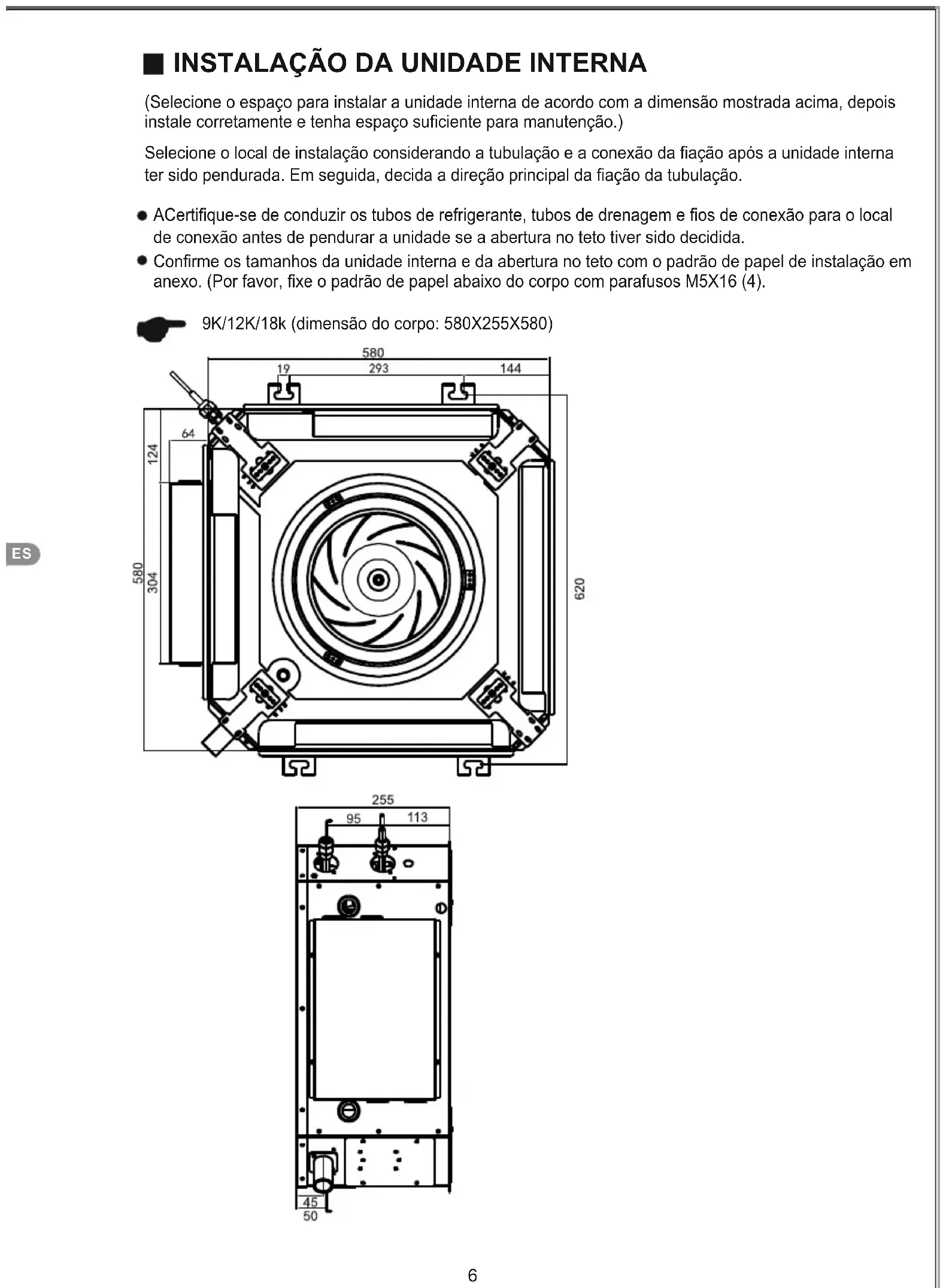 (Selecione o espaço para instalar a unidade interna de acordo com a dimensão mostrada acima, depois instale corretamente e tenha espaço suficiente para manutenção.) Selecione o local de instalação considerando a tubulação e a conexão da fiação após a unidade interna ter sido pendurada. Em seguida, decida a direção principal da fiação da tubulação. ACertifique-se de conduzir os tubos de refrigerante, tubos de drenagem e fios de conexão para o local de conexão antes de pendurar a unidade se a abertura no teto tiver sido decidida. Confirme os tamanhos da unidade interna e da abertura no teto com o padrão de papel de instalação em anexo. (Por favor, fixe o padrão de papel abaixo do corpo com parafusos M5X16 (4). 9K/12K/18k (dimensão do corpo: 580X255X580) PT7