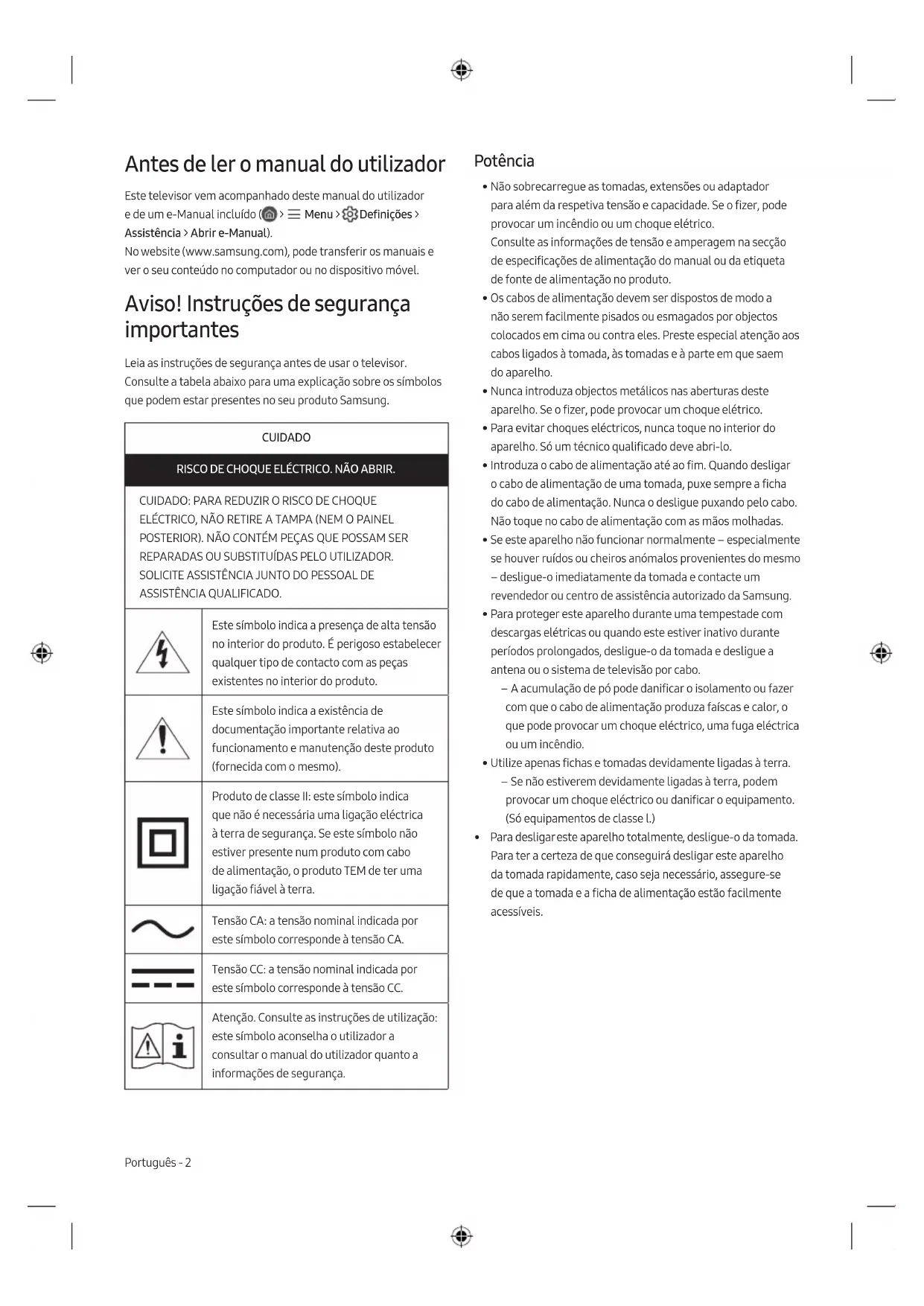 - Para desligar este aparelho totalmente, desligue-o da tomada. Para ter a certeza de que conseguirá desligar este aparelho da tomada rapidamente, caso seja necessário, assegure-se de que a tomada e a ficha de alimentação estão facilmente acessíveis. Antes de ler o manual do utilizador Este televisor vem acompanhado deste manual do utilizador e de um e-Manual incluído ( > Menu > Definições > Assistência > Abrir e-Manual). No website (www.samsung.com), pode transferir os manuais e ver o seu conteúdo no computador ou no dispositivo móvel. Aviso! Instruções de segurança importantes Leia as instruções de segurança antes de usar o televisor. Consulte a tabela abaixo para uma explicação sobre os símbolos que podem estar presentes no seu produto Samsung. CUIDADO RISCO DE CHOQUE ELÉCTRICO. NÃO ABRIR. CUIDADO: PARA REDUZIR O RISCO DE CHOQUE ELÉCTRICO, NÃO RETIRE A TAMPA (NEM O PAINEL POSTERIOR). NÃO CONTÉM PEÇAS QUE POSSAM SER REPARADAS OU SUBSTITUÍDAS PELO UTILIZADOR. SOLICITE ASSISTÊNCIA JUNTO DO PESSOAL DE ASSISTÊNCIA QUALIFICADO. Este símbolo indica a presença de alta tensão no interior do produto. É perigoso estabelecer qualquer tipo de contacto com as peças existentes no interior do produto. Este símbolo indica a existência de documentação importante relativa ao funcionamento e manutenção deste produto (fornecida com o mesmo). Produto de classe II: este símbolo indica que não é necessária uma ligação eléctrica à terra de segurança. Se este símbolo não estiver presente num produto com cabo de alimentação, o produto TEM de ter uma ligação fiável à terra. Tensão CA: a tensão nominal indicada por este símbolo corresponde à tensão CA. Tensão CC: a tensão nominal indicada por este símbolo corresponde à tensão CC. Atenção. Consulte as instruções de utilização: este símbolo aconselha o utilizador a consultar o manual do utilizador quanto a informações de segurança. Português Português - 2Instalação