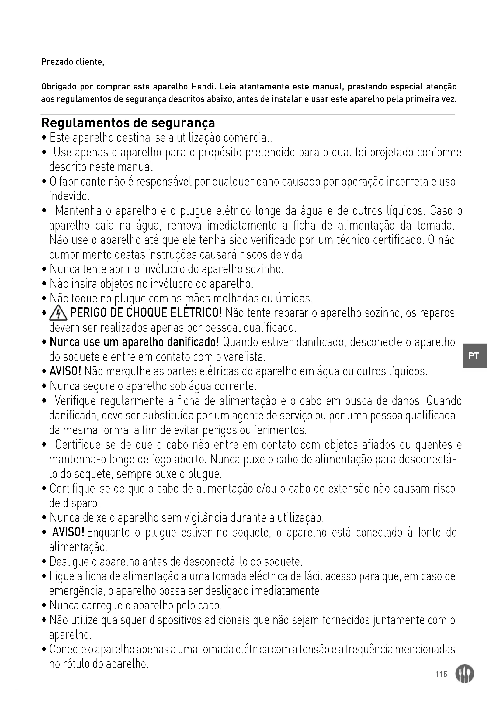 Prezado cliente, Obrigado por comprar este aparelho Hendi. Leia atentamente este manual, prestando especial atenção aos regulamentos de segurança descritos abaixo, antes de instalar e usar este aparelho pela primeira vez. Regulamentos de segurança