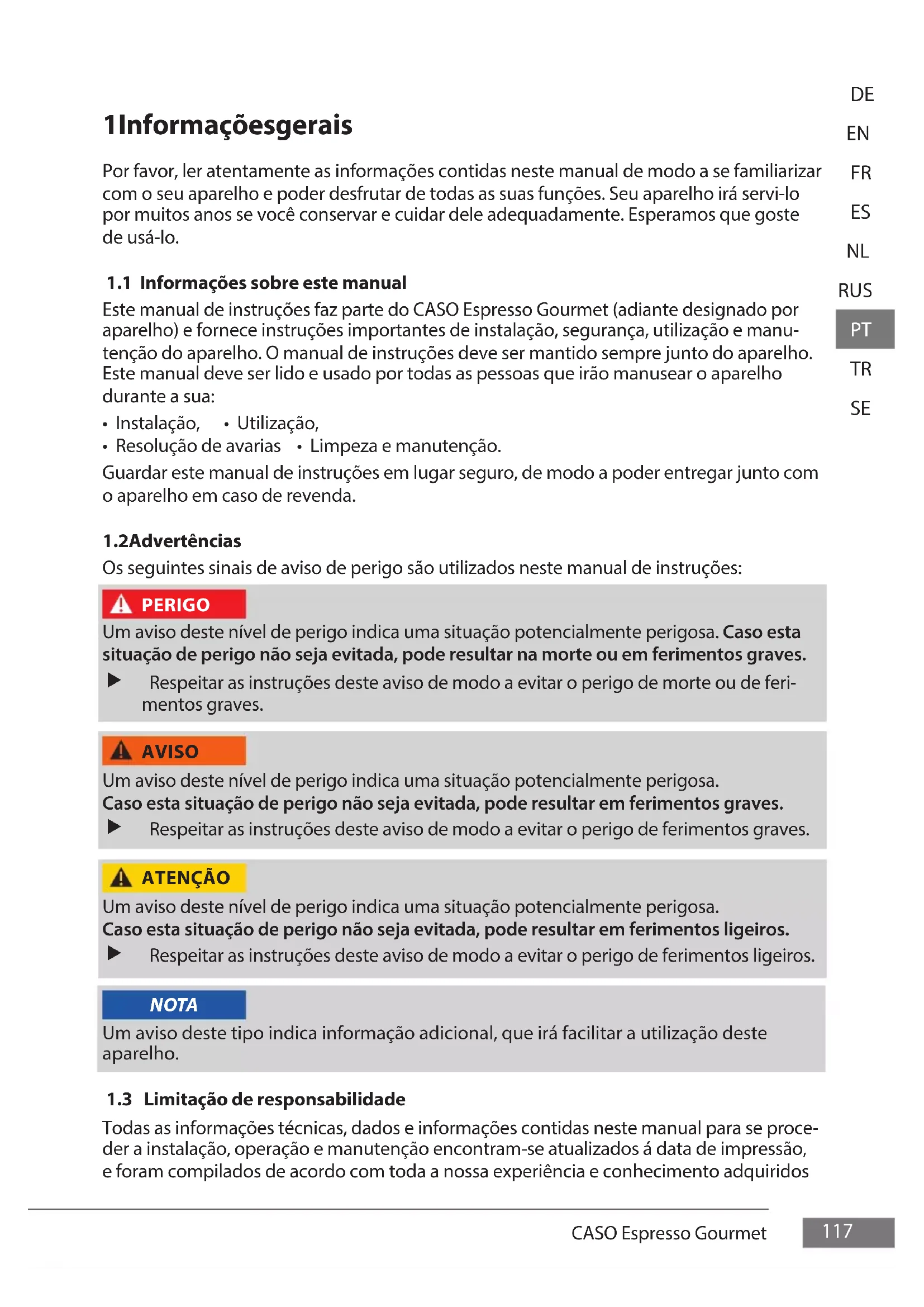 Este manual de instruções faz parte do CASO Espresso Gourmet (adiante designado por aparelho) e fornece instruções importantes de instalação, segurança, utilização e manu- tenção do aparelho. O manual de instruções deve ser mantido sempre junto do aparelho. Este manual deve ser lido e usado por todas as pessoas que irão manusear o aparelho durante a sua:
