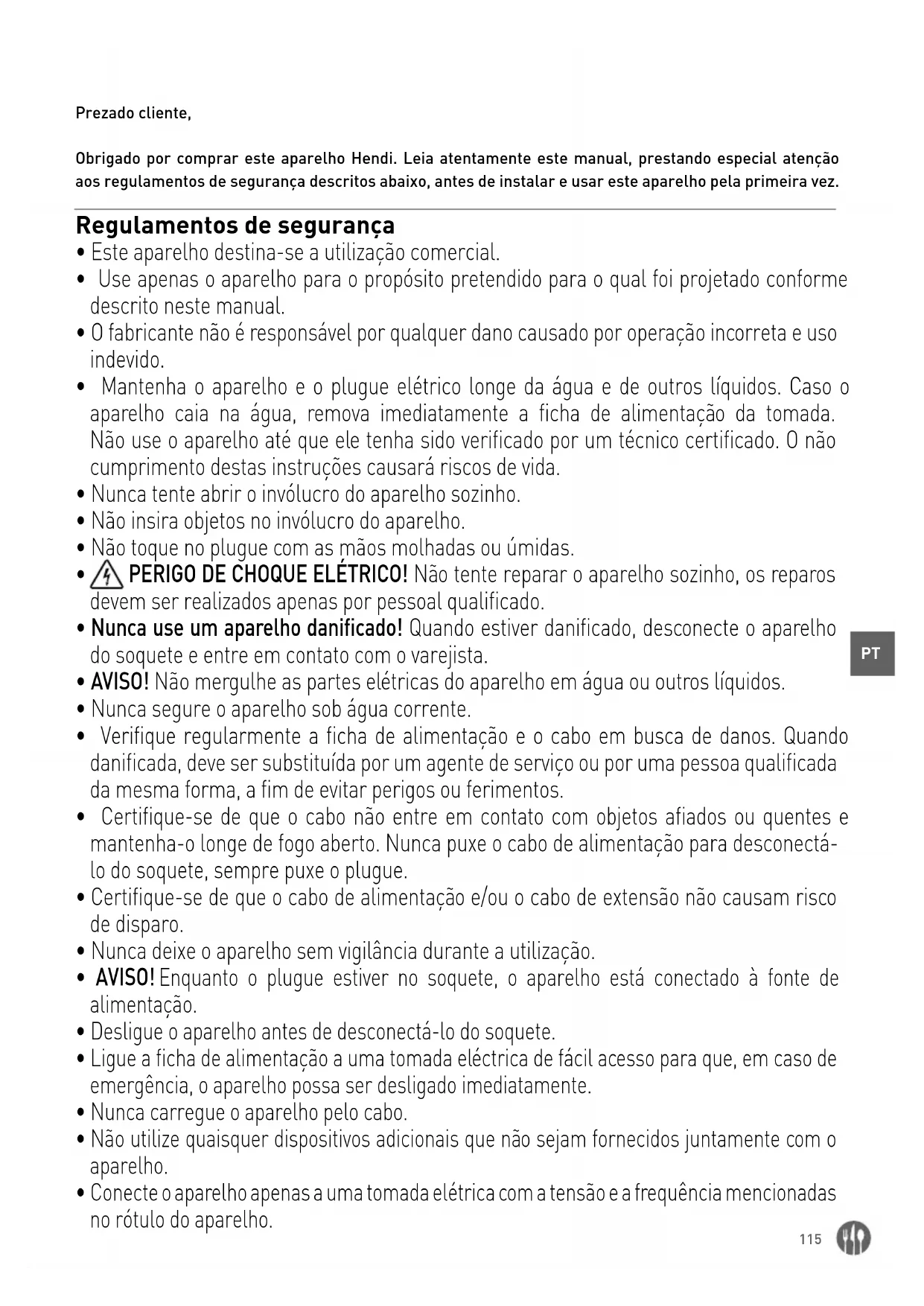 Prezado cliente, Obrigado por comprar este aparelho Hendi. Leia atentamente este manual, prestando especial atenção aos regulamentos de segurança descritos abaixo, antes de instalar e usar este aparelho pela primeira vez. Regulamentos de segurança
