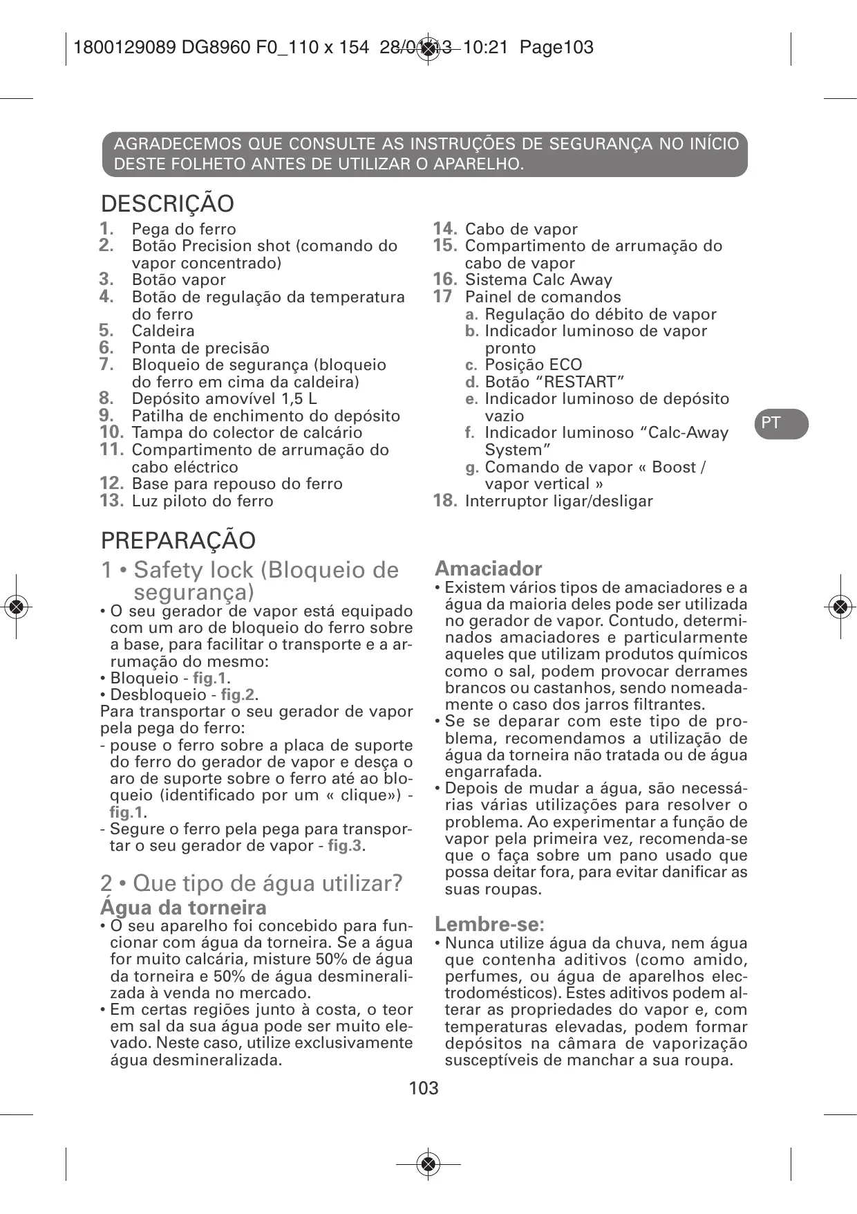 - Volte a colocar a tampa do colector de calcário no lugar - fig.23. O gerador de vapor não funciona sem o colector de calcário. Uma descalcificação regular do seu gerador de vapor permite manter um bom desempenho do vapor ao longo do tempo. Aquando da próxima utilização, prima o botão “Restart” situado no painel de comandos para desligar o indicador luminoso laranja “Calc-Away System”. PROBLEMAS COM O SEU GERADOR? Problemas Causas Soluções O gerador de vapor não liga ou a luz piloto do ferro e o interruptor luminoso ligar/desligar não estão acesos. A água sai pelos orifícios da base. O aparelho não está ligado à corrente. Verifique se o aparelho está devidamente ligado a uma tomada em estado de funcionamento e se está ligado à corrente. Está a utilizar o comando de vapor antes de o ferro estar suficientemente quente. Reduza o débito de vapor quando engoma a baixa temperatura (controlo do débito de vapor no painel de comandos). Aguarde que a luz piloto do ferro se apague antes de utilizar o comando do vapor. Carregue no comando de vapor fora da tábua de engomar até que o ferro produza vapor. A água condensou-se nos tubos porque está a utilizar o vapor pela primeira vez ou não o utilizava há já algum tempo. Utiliza a função “Boost” antes de o ferro estar suficientemente quente.