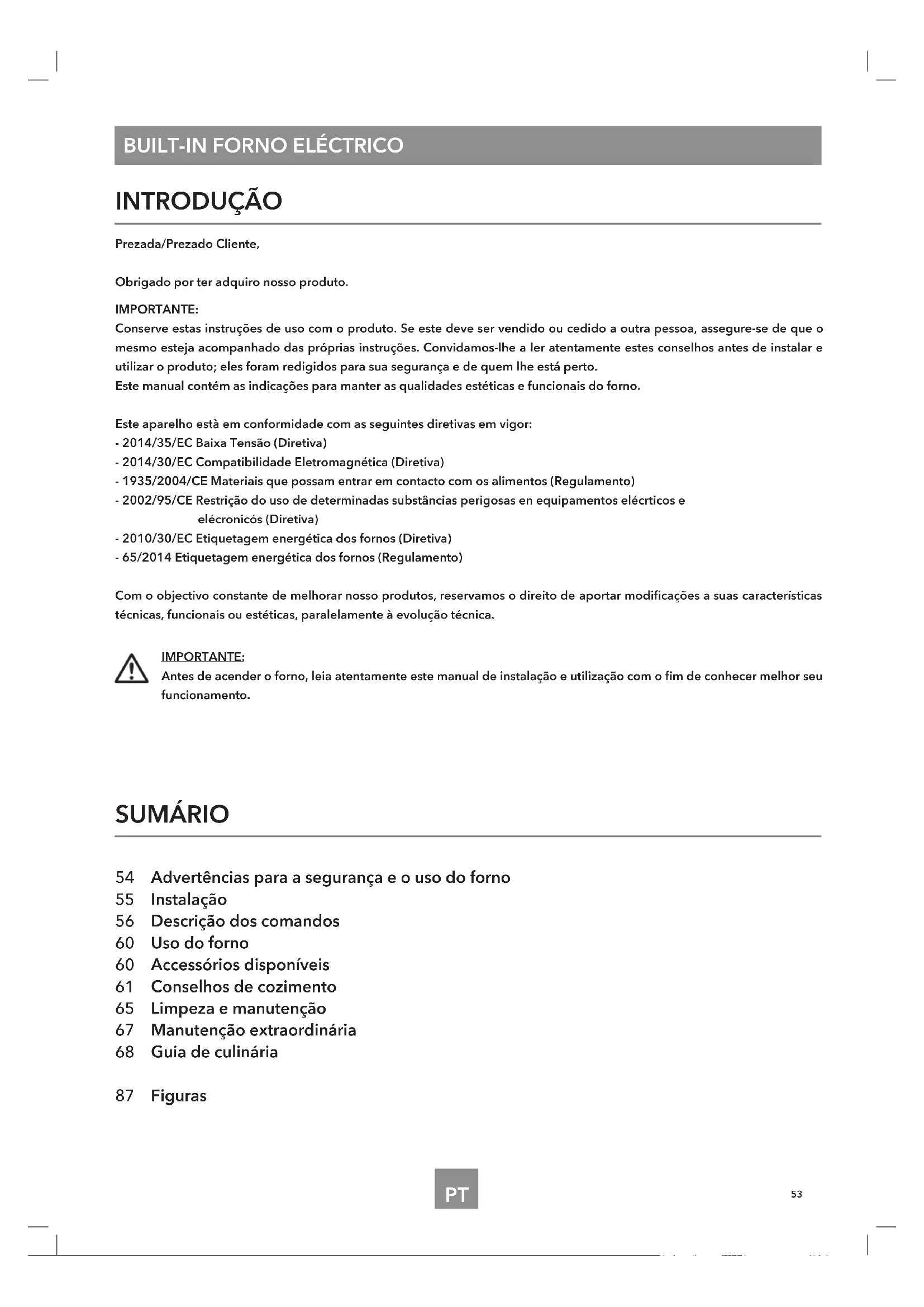 SUMÁRIO 54 Advertências para a segurança e o uso do forno 55 Instalação 56 Descrição dos comandos 60 Uso do forno 60 Accessórios disponíveis 61 Conselhos de cozimento 65 Limpeza e manutenção 67 Manutenção extraordinária 68 Guia de culinária 87 Figuras INTRODUÇÃO Prezada/Prezado Cliente, Obrigado por ter adquiro nosso produto. IMPORTANTE: Conserve estas instruções de uso com o produto. Se este deve ser vendido ou cedido a outra pessoa, assegure-se de que o mesmo esteja acompanhado das próprias instruções. Convidamos-lhe a ler atentamente estes conselhos antes de instalar e utilizar o produto; eles foram redigidos para sua segurança e de quem lhe está perto. Este manual contém as indicações para manter as qualidades estéticas e funcionais do forno. Este aparelho està em conformidade com as seguintes diretivas em vigor: - 2014/35/EC Baixa Tensão (Diretiva) - 2014/30/EC Compatibilidade Eletromagnética (Diretiva) - 1935/2004/CE Materiais que possam entrar em contacto com os alimentos (Regulamento) - 2002/95/CE Restrição do uso de determinadas substâncias perigosas en equipamentos elécrticos e elécronicós (Diretiva) - 2010/30/EC Etiquetagem energética dos fornos (Diretiva) - 65/2014 Etiquetagem energética dos fornos (Regulamento) Com o objectivo constante de melhorar nosso produtos, reservamos o direito de aportar modicações a suas características técnicas, funcionais ou estéticas, paralelamente à evolução técnica. IMPORTANTE: Antes de acender o forno, leia atentamente este manual de instalação e utilização com o m de conhecer melhor seu funcionamento.