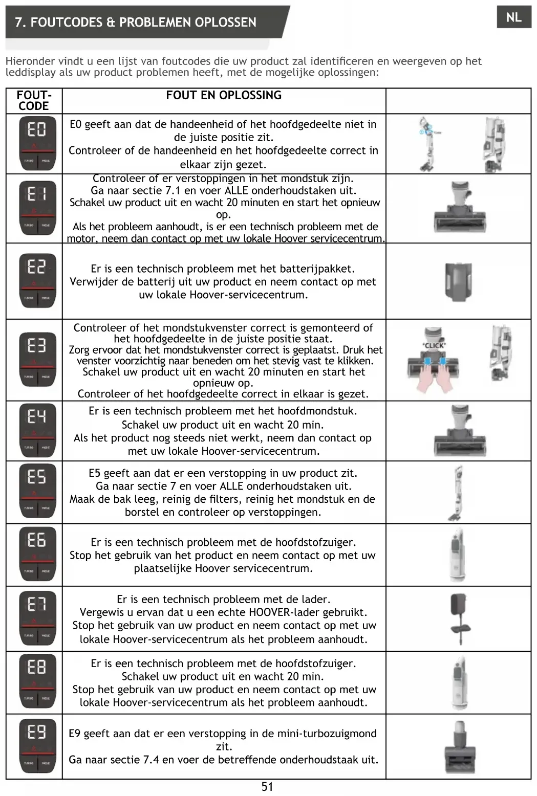 E0 indica que o dispositivo portátil ou o corpo principal não está na posição correta. Controle se o dispositivo portátil e o corpo principal estão montados corretamente. Verique se existe alguma obstrução na escova. Vá para a secção 7.1 e efetue TODOS os requisitos de manutenção. Desligue o seu produto e espere 20 minutos e depois reinicie. Se o problema persistir, há um problema técnico no motor, entre em contacto com o centro de assistência local da Hoover. Há um problema técnico na bateria. Retire a bateria do produto e entre em contacto com o centro de assistência local da Hoover. Verique se a janela do bocal está corretamente montada ou se o corpo principal está na posição correta. Certique-se de que a janela do bico está no lugar certo. Pres- sione a janela para baixo suavemente para clicar rmemente. Desligue o seu produto e espere 20 minutos e depois reinicie. Verique se o corpo principal está montado corretamente. Há um problema técnico na escova principal. Desligue o seu produto e espere 20min. Se o produto ainda não funcionar, entre em contacto com o centro de assistência local da Hoover. E5 indica que há um bloqueio no produto. Vá para a secção 7 e efetue TODOS os requisitos de ma- nutenção. Esvazie o contentor, limpe os ltros, limpe o bocal e a escova rotativa e verique se há bloqueios. Existe um problema técnico na aspiração principal. Pare de utilizar o produto e entre em contacto com o centro de assistência local da Hoover. Há um problema técnico no carregador. Certique-se de que está a utilizar um carregador HOOVER genuíno. Se o problema persistir, pare de usar o produto e entre em contacto com o centro de assistência local da Hoover. Existe um problema técnico na aspiração principal. Desligue o seu produto e espere 20min. Se o problema persistir, pare de usar o produto e entre em contacto com o centro de assistência local da Hoover. E9 indica que há um bloqueio na escova mini turbo. Vá para a secção 7.4 e execute a tarefa de manutenção indica- da. PTA