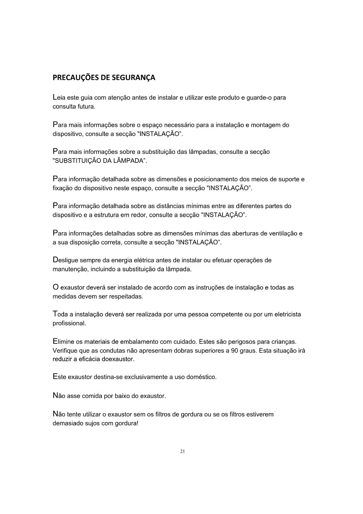 Leia este guia com atenção antes de instalar e utilizar este produto e guarde-o para consulta futura. Para mais informações sobre o espaço necessário para a instalação e montagem do dispositivo, consulte a secção "INSTALAÇÃO”. Para mais informações sobre a substituição das lâmpadas, consulte a secção "SUBSTITUIÇÃO DA LÂMPADA”. Para informação detalhada sobre as dimensões e posicionamento dos meios de suporte e fixação do dispositivo neste espaço, consulte a secção "INSTALAÇÃO”. Para informação detalhada sobre as distâncias mínimas entre as diferentes partes do dispositivo e a estrutura em redor, consulte a secção "INSTALAÇÃO”. Para informações detalhadas sobre as dimensões mínimas das aberturas de ventilação e a sua disposição correta, consulte a secção "INSTALAÇÃO”.