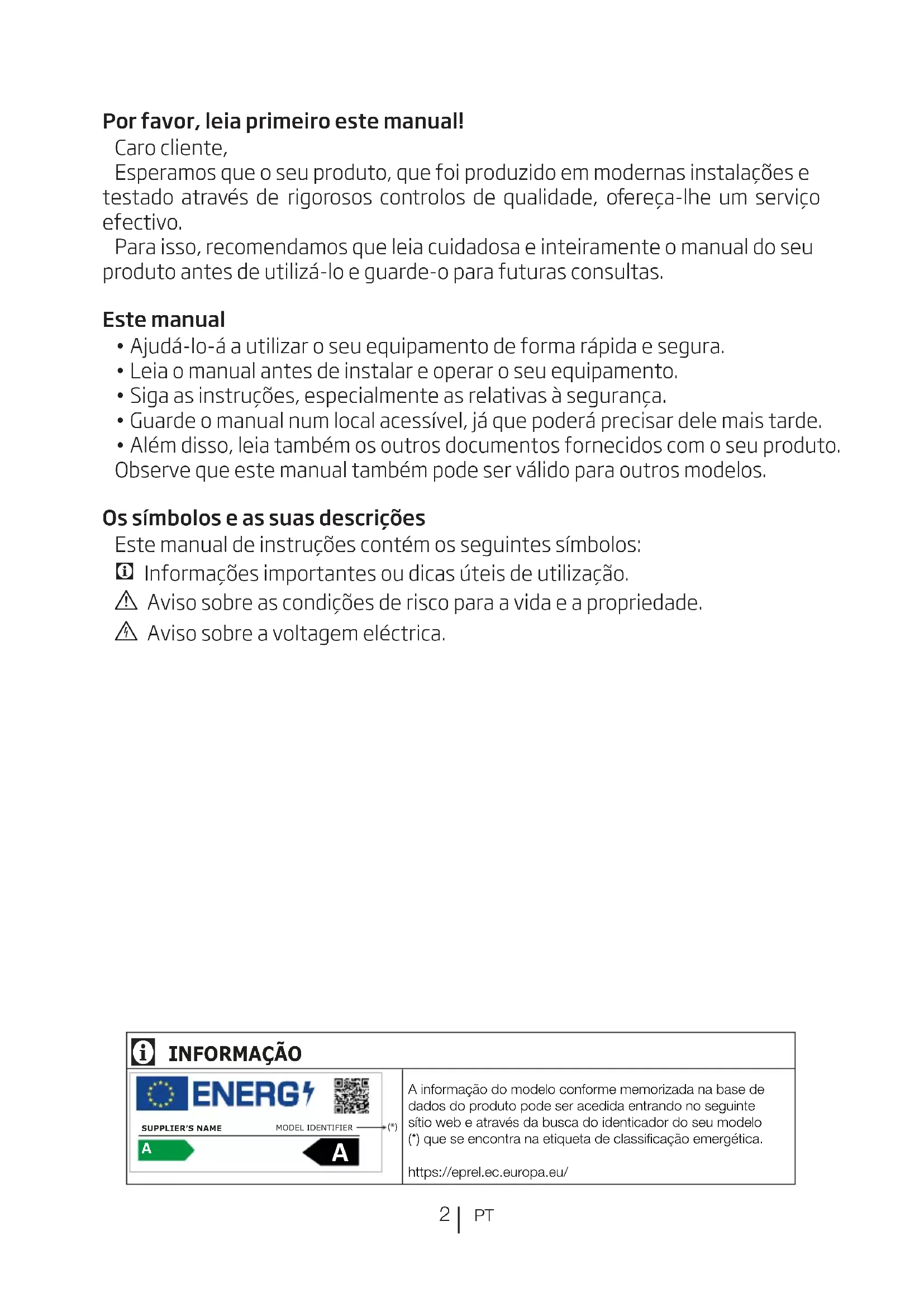A informação do modelo conforme memorizada na base de dados do produto pode ser acedida entrando no seguinte sítio web e através da busca do identicador do seu modelo (*) que se encontra na etiqueta de classificação emergética.https://eprel.ec.europa.eu/