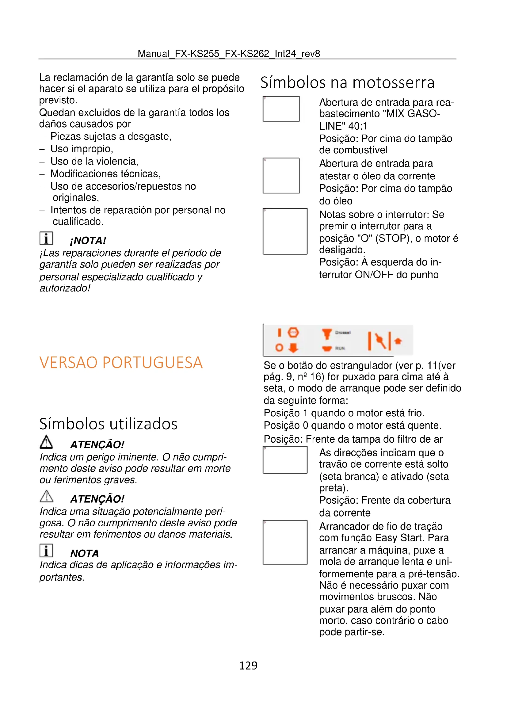 ATENÇÃO! A motosserra está equipada com um sistema sistema Easy-Start. Não puxar o punho de arranque de forma rápida ou brusca.Manual_FX-KS255_FX-KS262_Int24_rev8