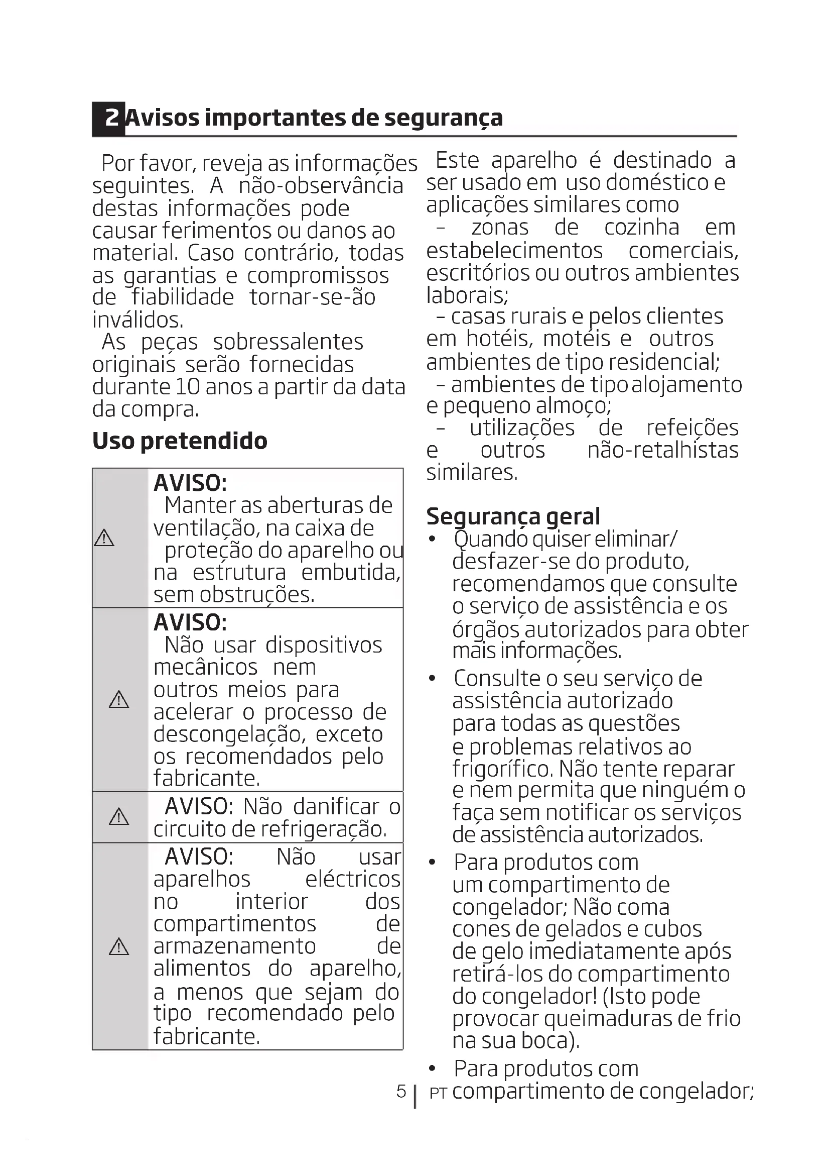 e pequeno almoço; – utilizações de refeições e outros não-retalhistas similares. Segurança geral Quando quiser eliminar/ desfazer-se do produto, recomendamos que consulte o serviço de assistência e os