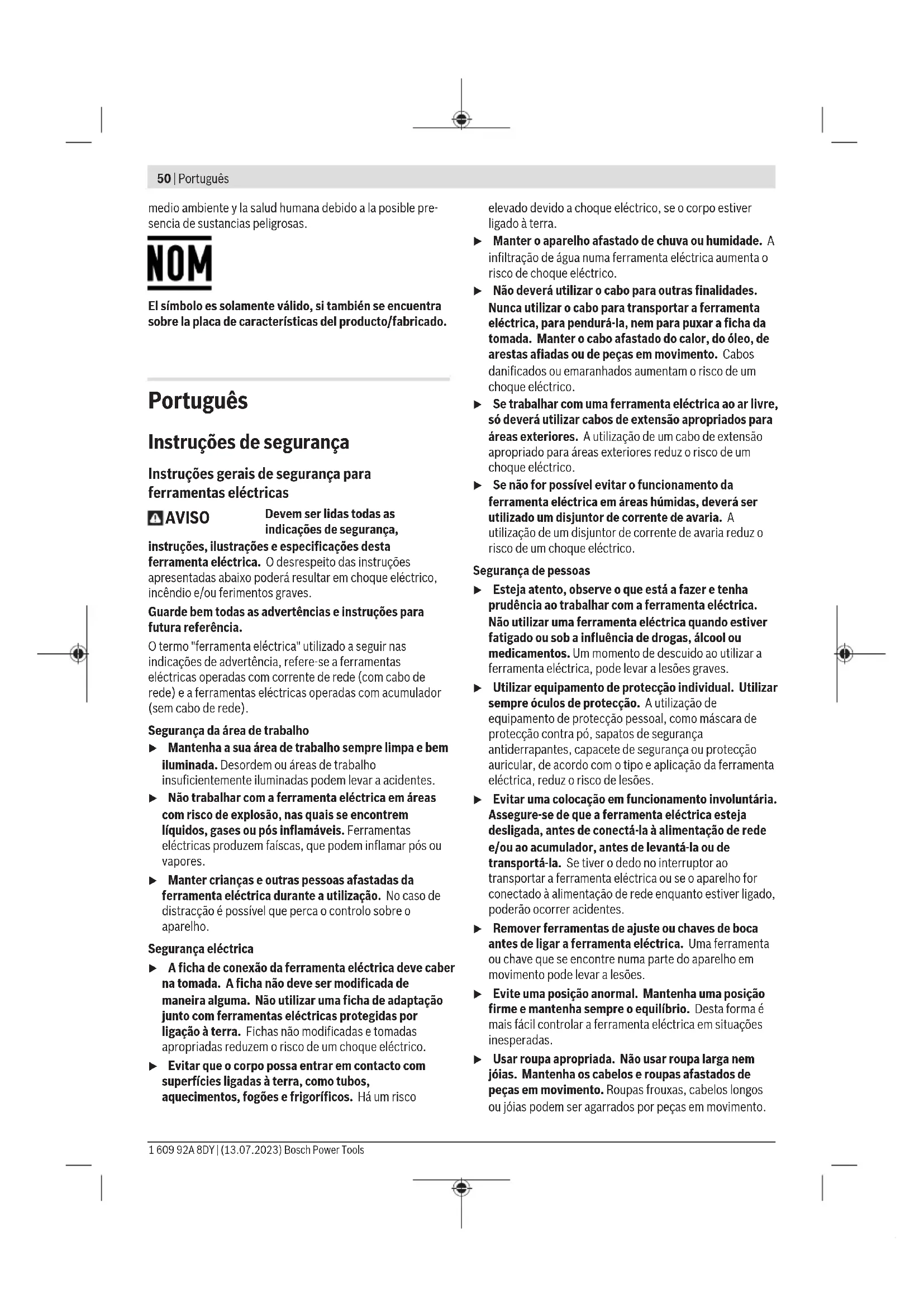 O lixamento de chapas finas ou de outros materiais facilmente vibrantes com grande superfície pode causar um valor de emissão de ruído aumentado até 15dB. Através de tapetes pesados de amortecimento é possível reduzir a elevada emissão sonora. A elevada emissão de ruído deve ser considerada tanto na avaliação dos riscos da potência do ruído como na seleção de uma proteção auditiva adequada. O nível de vibrações indicado nestas instruções e o valor de emissões sonoras foram medidos de acordo com um processo de medição normalizado e podem ser utilizados para a comparação de ferramentas elétricas. Também são adequados para uma avaliação provisória das emissões sonoras e de vibrações. O nível de vibrações indicado e o valor de emissões sonoras representam as aplicações principais da ferramenta elétrica. Se a ferramenta elétrica for utilizada para outras aplicações, com outras ferramentas de trabalho ou com manutenção insuficiente, é possível que o nível de vibrações e de emissões sonoras seja diferente. Isto pode aumentar sensivelmente a emissão sonora e de vibrações para o período completo de trabalho. Para uma estimação exata da emissão sonora e de vibrações, também deveriam ser considerados os períodos nos quais o aparelho está desligado ou funciona, mas não está sendo utilizado. Isto pode reduzir a emissão sonora e de vibrações durante o completo período de trabalho. Além disso também deverão ser estipuladas medidas de segurança para proteger o operador contra o efeito de vibrações, como por exemplo: manutenção de ferramentas elétricas e acessórios, manter as mãos quentes e organização dos processos de trabalho. Proteção contra rearranque involuntário A proteção contra rearranque involuntário evita que a ferramenta elétrica possa arrancar descontroladamente após uma interrupção da alimentação de corrente elétrica. Para recolocar em funcionamento coloque o interruptor de ligar/desligar (3) na posição desligada e ligue novamente a ferramenta elétrica. Montagem Montar o dispositivo de proteção u Antes de todos trabalhos na ferramenta elétrica deverá puxar a ficha de rede da tomada. Nota: Se o disco abrasivo quebrar durante o funcionamento ou se os dispositivos de fixação na tampa de proteção/na ferramenta elétrica estiverem danificados, será necessário que a ferramenta elétrica seja enviada imediatamente ao serviço pós-venda, os endereços encontram-se na secção "Serviço pós-venda e aconselhamento". Tampa de proteção para lixar Coloque a tampa de proteção (7) no encaixe na ferramenta elétrica até as saliências de codificação da tampa de proteção coincidirem com o encaixe. Para tal, prima e segure a alavanca de destravamento (1). Pressione a tampa de proteção (7) na gola do veio até o colar da tampa de proteção assentar no flange da ferramenta elétrica e rode a tampa de proteção, até esta encaixar de forma audível. Ajuste a posição da tampa de proteção (7) de acordo com os requisitos da operação. Para tal, prima a alavanca de destravamento (1) para cima e rode a tampa de proteção (7) para a posição desejada. Bosch Power Tools 1 609 92A 8DY | (13.07.2023)56 | Português u Ajuste sempre a tampa de proteção (7) de forma a que os dois cames da alavanca de destravamento(1) encaixem nos respetivos entalhes da tampa de proteção(7). u Ajuste a tampa de proteção (7)de modo a evitar que voem faíscas na direção do operador. u No sentido de rotação do acessório, a tampa de proteção(7) só pode ser rodada quando se aciona a alavanca de destravamento(1) ! Caso contrário, não deverá de modo algum continuar a utilizar a ferramenta elétrica, mas enviá-la ao serviço pós- venda. Nota: As saliências de codificação nas tampas de proteção (7)asseguram que só é montada a tampa de proteção adequada na ferramenta elétrica. Capa de aspiração para lixar Para lixar tintas, vernizes e plásticos com pouco pó em conjunto com mós tipo tacho de metal duro(11) pode utilizar a tampa de aspiração(6). A tampa de aspiração(6) não é indicada para trabalhar com metais. Na tampa de aspiração(6) pode ser conectado um aspirador de pó Bosch apropriado. Para isso, encaixe a mangueira de aspiração com o adaptador de aspiração nas peças de alojamento previstas da tampa de aspiração. Tampa de proteção para cortar u Para cortar utilize sempre a tampa de proteção para cortar(8) ou a tampa de proteção para lixar (7) juntamente com a cobertura para cortar(9). u Ao cortar em pedra assegure uma aspiração de pó suficiente. A tampa de proteção para cortar(8) é montada como a tampa de proteção para lixar(7). Cobertura para cortar em metal Monte a cobertura para cortar(9) em metal na tampa de proteção para lixar(7) (verfiguraA): oscile o arco de suporte para trás (➊). Encaixe a cobertura(9) na tampa de proteção para lixar(7) (➋). Pressione o arco de suporte na tampa de proteção(7) (➌). Para a desmontagem (verfiguraB) pressione o botão no arco de suporte (➊) e oscile-o para trás (➋). Retire a cobertura(9) da tampa de proteção(7) (➌). Cobertura para cortar em plástico Encaixe a cobertura para cortar(9) em plástico na tampa de proteção para lixar(7) (verfiguraC). A cobertura(9) engata de forma audível e visível na tampa de proteção(7). Para a desmontagem (verfiguraD) desbloqueie a cobertura(9) na tampa de proteção(7) (➊) esquerda ou direita e retire a cobertura (➋). Tampa de aspiração para cortar com patim de guia A tampa de aspiração para cortar com patim de guia(30) é montada como a tampa de proteção para lixar. Mediante a fixação do punho adicional(5)/(4) através do arco na tampa de aspiração na carcaça da engrenagem, a ferramenta elétrica é ligada de forma fixa com a tampa de aspiração. Na tampa de aspiração com patim de guia(30) pode ser conectado um aspirador de pó Bosch aprop