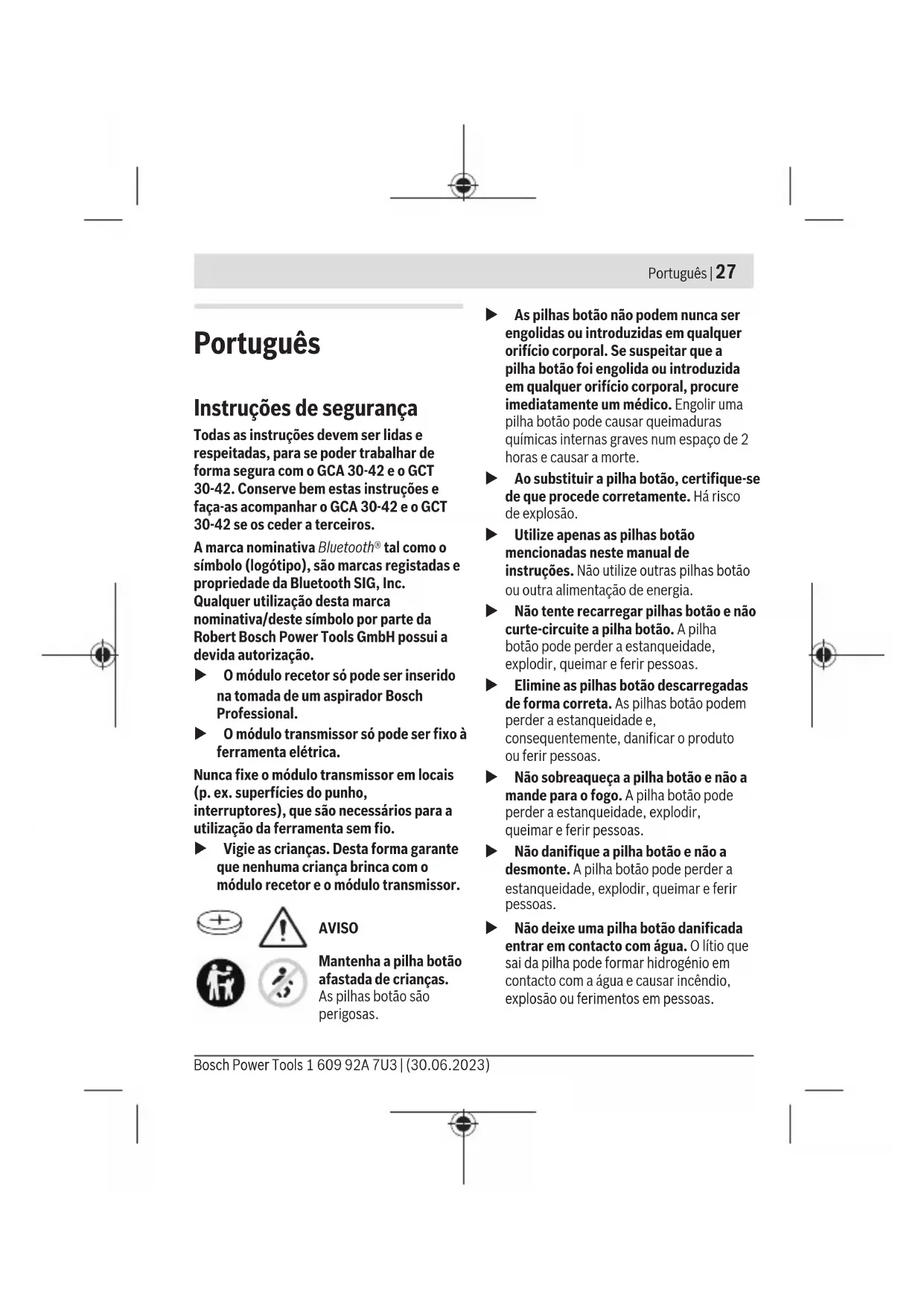 cualquier interferencia. Incluyendo la que pueda causar su operación no dese- ada. 1 609 92A 7U3 | (30.06.2023) Bosch Power ToolsPortuguês | 27 Português Instruções de segurança Todas as instruções devem ser lidas e respeitadas, para se poder trabalhar de forma segura com oGCA30-42 e o GCT 30-42. Conserve bem estas instruções e faça-as acompanhar oGCA30-42 e o GCT 30-42 se os ceder a terceiros. A marca nominativa Bluetooth® tal como o símbolo (logótipo), são marcas registadas e propriedade da Bluetooth SIG, Inc. Qualquer utilização desta marca nominativa/deste símbolo por parte da Robert Bosch Power Tools GmbH possui a devida autorização. u O módulo recetor só pode ser inserido na tomada de um aspirador Bosch Professional. u O módulo transmissor só pode ser fixo à ferramenta elétrica. Nunca fixe o módulo transmissor em locais (p. ex. superfícies do punho, interruptores), que são necessários para a utilização da ferramenta sem fio. u Vigie as crianças. Desta forma garante que nenhuma criança brinca com o módulo recetor e o módulo transmissor. AVISO Mantenha a pilha botão afastada de crianças. As pilhas botão são perigosas. u As pilhas botão não podem nunca ser engolidas ou introduzidas em qualquer orifício corporal. Se suspeitar que a pilha botão foi engolida ou introduzida em qualquer orifício corporal, procure imediatamente um médico. Engolir uma pilha botão pode causar queimaduras químicas internas graves num espaço de 2 horas e causar a morte. u Ao substituir a pilha botão, certifique-se de que procede corretamente. Há risco de explosão. u Utilize apenas as pilhas botão mencionadas neste manual de instruções. Não utilize outras pilhas botão ou outra alimentação de energia. u Não tente recarregar pilhas botão e não curte-circuite a pilha botão. A pilha botão pode perder a estanqueidade, explodir, queimar e ferir pessoas. u Elimine as pilhas botão descarregadas de forma correta. As pilhas botão podem perder a estanqueidade e, consequentemente, danificar o produto ou ferir pessoas. u Não sobreaqueça a pilha botão e não a mande para o fogo. A pilha botão pode perder a estanqueidade, explodir, queimar e ferir pessoas. u Não danifique a pilha botão e não a desmonte. A pilha botão pode perder a estanqueidade, explodir, queimar e ferir pessoas. u Não deixe uma pilha botão danificada entrar em contacto com água. O lítio que sai da pilha pode formar hidrogénio em contacto com a água e causar incêndio, explosão ou ferimentos em pessoas. Bosch Power Tools 1 609 92A 7U3 | (30.06.2023)28 | Português Descrição do produto e do serviço Utilização adequada O módulo recetor GCA30-42 recebe um sinal de iniciar/parar para um aspirador Bosch Professional. Este sinal é transmitido pelo módulo transmissor GCT30-42. Para mais informações consulte as instruções de utilização do módulo transmissor GCT30-42 e do aspirador utilizado. Componentes ilustrados A numeração dos componentes exibidos diz respeito às representações existentes nas páginas dos gráficos. Componentes GCA 30-42 (1) Módulo recetor (2) Indicação estado com símbolo arranque automático (interface do utilizador) (3) Tecla (interface do utilizador) (4) Conector Componentes GCT 30-42 (5) Módulo transmissor (6) Indicador de estado LED (interface do utilizador) (7) Botão iniciar/parar (interface do utilizador) (8) Gancho de fixação elástico (9) Elástico Dados técnicos Módulo recetor GCA 30-42 Número de produto 1 600 A02 GE. Módulo recetor GCA 30-42 Temperatura de serviço −20...+50°C Temperatura de armazenamento −20...+65°C Dimensões (largura x altura) 91 x 121 mm Transferência de dados Bluetooth® Bluetooth® 4.2 (Low Energy) Faixa de frequência usada 2402–2480 MHz Potência de saída <10 mW Módulo transmissor GCT 30-42 Número de produto 1 600 A02 GH. Temperatura de serviço −20...+50°C Temperatura de armazenamento −20...+65°C Dimensões