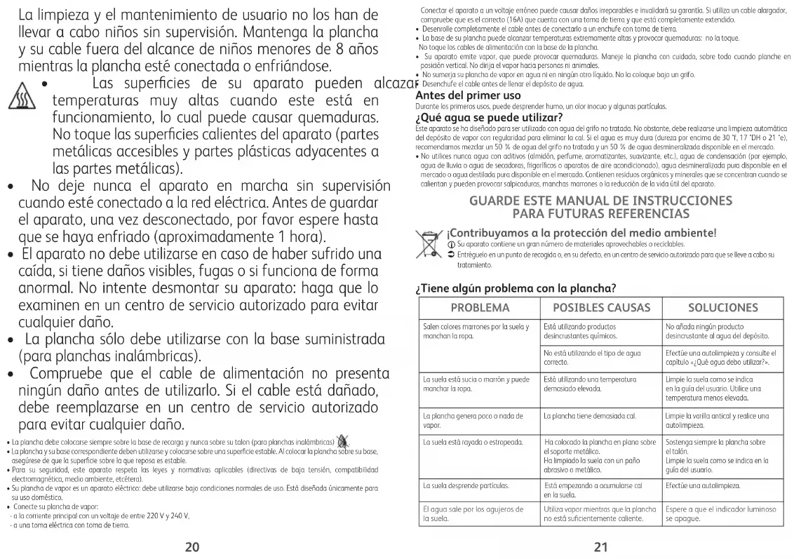 - Nunca utilize água com aditivos (amido, perfume, aromas, amaciador, etc.), água de condensação (por exemplo, água da chuva ou água de máquinas de secar a roupa, frigoríficos ou aparelhos de ar condicionado), água pura desmineralizada ou água pura destilada disponíveis no mercado. Estas contêm resíduos orgânicos e minerais que se concentram sob o efeito do calor e podem causar salpicos, provocar manchas de água castanhas ou reduzir a vida útil do seu aparelho. GUARDE ESTE MANUAL DE INSTRUÇÕES PARA FUTURAS UTILIZAÇÕES Protecção do meio ambiente em primeiro lugar!