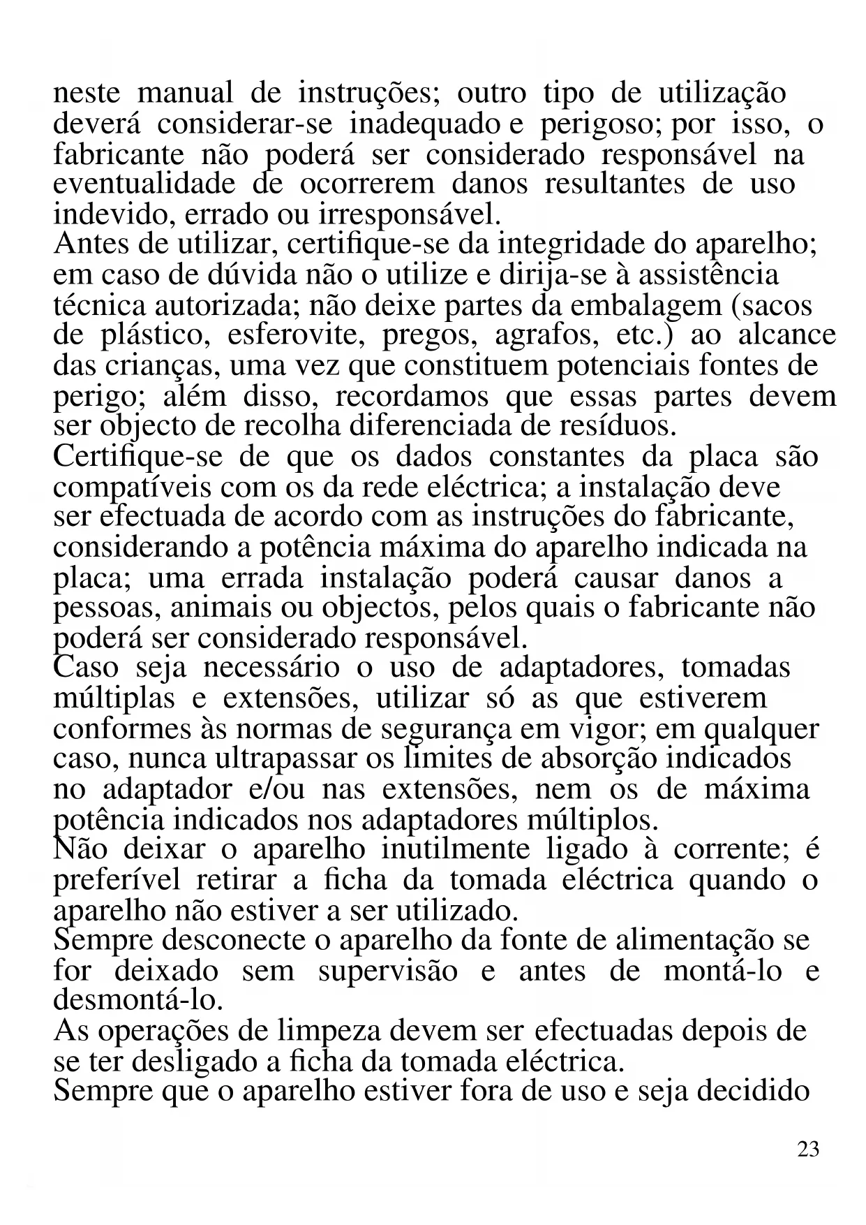 As indicações seguintes são muito importantes no que se refere à instalação, uso e manutenção deste aparelho; conserve com cuidado este manual para eventuais futuras consultas; utilize o aparelho apenas do modo indicado23 neste manual de instruções; outro tipo de utilização deverá considerar-se inadequado e perigoso; por isso, o fabricante não poderá ser considerado responsável na eventualidade de ocorrerem danos resultantes de uso indevido, errado ou irresponsável. Antes de utilizar, certifique-se da integridade do aparelho; em caso de dúvida não o utilize e dirija-se à assistência técnica autorizada; não deixe partes da embalagem (sacos de plástico, esferovite, pregos, agrafos, etc.) ao alcance das crianças, uma vez que constituem potenciais fontes de perigo; além disso, recordamos que essas partes devem ser objecto de recolha diferenciada de resíduos. Certifique-se de que os dados constantes da placa são compatíveis com os da rede eléctrica; a instalação deve ser efectuada de acordo com as instruções do fabricante, considerando a potência máxima do aparelho indicada na placa; uma errada instalação poderá causar danos a pessoas, animais ou objectos, pelos quais o fabricante não poderá ser considerado responsável. Caso seja necessário o uso de adaptadores, tomadas múltiplas e extensões, utilizar só as que estiverem conformes às normas de segurança em vigor; em qualquer caso, nunca ultrapassar os limites de absorção indicados no adaptador e/ou nas extensões, nem os de máxima potência indicados nos adaptadores múltiplos. Não deixar o aparelho inutilmente ligado à corrente; é preferível retirar a ficha da tomada eléctrica quando o aparelho não estiver a ser utilizado. Sempre desconecte o aparelho da fonte de alimentação se for deixado sem supervisão e antes de montá-lo e desmontá-lo. As operações de limpeza devem ser efectuadas depois de se ter desligado a ficha da tomada eléctrica. Sempre que o aparelho estiver fora de uso e seja decidido24 não o reparar, recomenda-se a sua inutilização, cortando- lhe o cabo de alimentação; - Não aproximar o cabo de alimentação de objectos cortantes ou de superfícies quentes, e não o puxar para arrancar a ficha da tomada eléctrica. Não deixe que ele fique pendurado na bancada onde a criança pode segurá- lo. Não utilizar o aparelho no caso de o cabo de alimentação ou a ficha se encontrarem danificados, ou em caso de curto-circuitos; Nessa eventualidade, leve o aparelho a um centro de assistência autorizado. - Não expor o aparelho a condições atmosféricas adversas, como chuva, humidade, gelo, etc. Conserve-o em lugares secos. Não manusear ou tocar o aparelho com as mãos molhadas ou os pés descalços. - Este aparelho pode ser utilizado por crianças com mais de 8 anos e por pessoas com reduzida capacidade física, sensorial ou mental, ou ainda com falta de experiência na sua utilização, desde que lhes seja assegurada uma adequada supervisão ou se tiverem sido instruídas no uso do aparelho em segurança; as operações de limpeza e de manutenção não devem ser efectuadas por crianças, a menos que tenham mais de 8 anos e sejam supervisionadas. - As crianças não devem brincar com o aparelho. - Mantenha o aparelho e o cabo de alimentação fora do alcance de crianças com menos de 8 anos de idade. - Não indicado para uso comercial. Só para uso doméstico. Em caso de avaria e/ou de mau funcionamento, não intervenha sobre o aparelho. Para uma eventual reparação dirija-se unicamente a um centro autorizado pelo fabricante e solicite peças de substituição originais. A não observância destas indicações pode comprometer a segurança do aparelho e tornar inválida a garantia.25 ATENÇÃO: este aparelho inclui uma função de aquecimento. Algumas superfícies, mesmo que não a placa propriamente dita, poderão atingir temperaturas elevadas. Uma vez que a sensibilidade à temperatura difere de pessoa para pessoa, este aparelho deverá ser usado com CUIDADO. Coloque o aparelho exclusivamente sobre superfícies com aderência e preparadas para o efeito, e use as necessárias medidas de protecção contra o calor, como pegas ou luvas. - Este aparelho foi concebido para uso doméstico ou equivalente, em situações como as de refeitórios em pequenas empresas ou outros ambientes de natureza laboral; por clientes de hotéis, motéis ou acomodação turística, como turismo rural ou residencial. - Este aparelho não foi concebido para ser utilizado por intermédio de um temporizador externo ou de um sistema de comando à distância autónomo. - Antes de cada utilização, soltar o cabo de alimentação. - Utilizar somente acessórios e componentes originais. Não sujeite produto a impactos, pois isso pode danificá-lo Mantenga la unidad lejos de materiales inflamables, calor, puntos fríos y vapor.