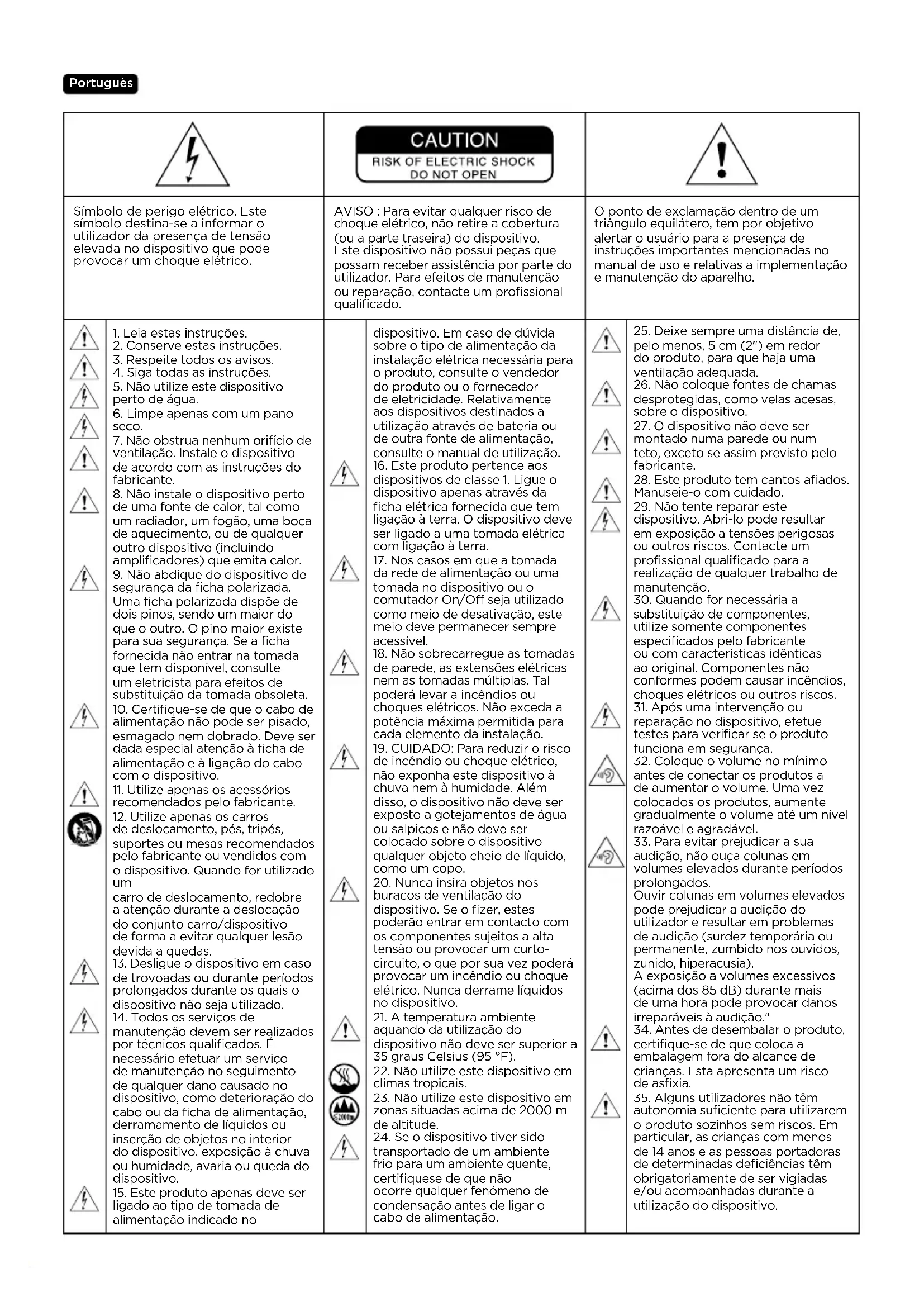 manutenção devem ser realizados por técnicos qualificados. É necessário efetuar um serviço de manutenção no seguimento de qualquer dano causado no dispositivo, como deterioração do cabo ou da ficha de alimentação, derramamento de líquidos ou inserção de objetos no interior do dispositivo, exposição à chuva ou humidade, avaria ou queda do dispositivo.