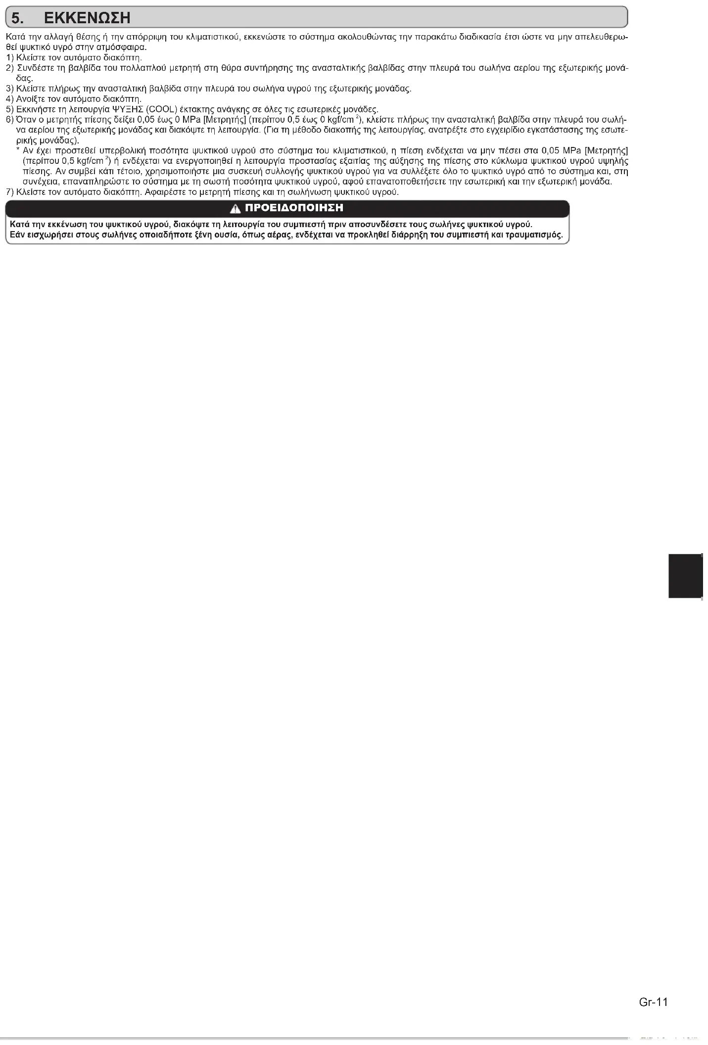 - Instale as unidades exteriores num local onde, pelo menos, uma das quatro laterais seja aberta e cujo espaço seja sucientemente amplo e não tenha depressões. OK OK OK NG VG79A985H01_pt.indd 3 2018-10-11 13:24:50Po-4 1-4-1. Área mínima de instalação para unidades exteriores Se tiver de instalar uma unidade num espaço onde todas as quatro laterais cam bloqueadas ou no qual existem depressões, conrme que se verica uma das situações (A, B ou C) seguintes. Nota: Estas contramedidas destinam-se a manter a segurança e não constituem nenhuma garantia de desempenho. A) Assegure um espaço de instalação suciente (Amín - área mínima de instalação). Instale num espaço com uma área de instalação de Amín ou mais, equivalente à quantidade de refrigerante M (refrigerante abastecido de fábrica + refri- gerante adicionado localmente). M [kg] Amín [m²] 1,0 12 1,5 17 2,0 23 2,5 28 3,0 34 3,5 39 4,0 45 4,5 50 5,0 56 5,5 62 6,0 67 6,5 73 7,0 78 7,5 84 C) Crie uma área aberta para ventilação adequada. Certique-se de que a largura da área aberta é de 0,9 [m] ou mais e que a altura da área aberta é de 0,15 [m] ou mais. No entanto, a altura entre a parte inferior do espaço de instalação e a extremidade inferior da área aberta deve ser de 0,125 [m] ou menos. A área aberta deve ter uma abertura de 75% ou mais. B) Instale num espaço com uma profundidade de [ 0,125 [m]. Amín Altura de 0,125 [m] ou menos a partir da parte inferior Abertura de 75% ou mais Altura de 0,125 [m] ou menos a partir da parte inferior Largura L 0,9 [m] ou mais Altura de 0,125 [m] ou menos a partir da parte inferior Altura A 0,15 [m] ou mais VG79A985H01_pt.indd 4 2018-10-11 13:24:50Po-5 1-4-2. Área mínima de instalação para unidades interiores Instale numa divisão com uma área de piso de Amín ou mais, equivalente à quantidade de refrigerante M (refrigerante abastecido de fábrica + refrigerante adicionado localmente). Instale a unidade interior para que a altura entre o piso e a parte inferior da unidade interior seja h0; se montada na parede: 1,8 m ou mais; se suspensa do tecto, cassete e oculta no tecto: 2,2 m ou mais. Existem restrições na altura de instalação para cada modelo, por isso leia o manual de instalação de cada unidade em particular. M [kg] Amín [m²] 1,0 3 1,5 4,5 2,0 6 2,5 7,5 3,0 9 3,5 12 4,0 15,5 4,5 20 5,0 24 5,5 29 6,0 35 6,5 41 7,0 47 7,5 54 Montada na parede h0 ] 1,8 [m] Oculta no tectoCasseteSuspensa do tecto h0 ] 2,2 [m]h0 ] 2,2 [m]h0 ] 2,2 [m] VG79A985H01_pt.indd 5 2018-10-11 13:24:50Po-6