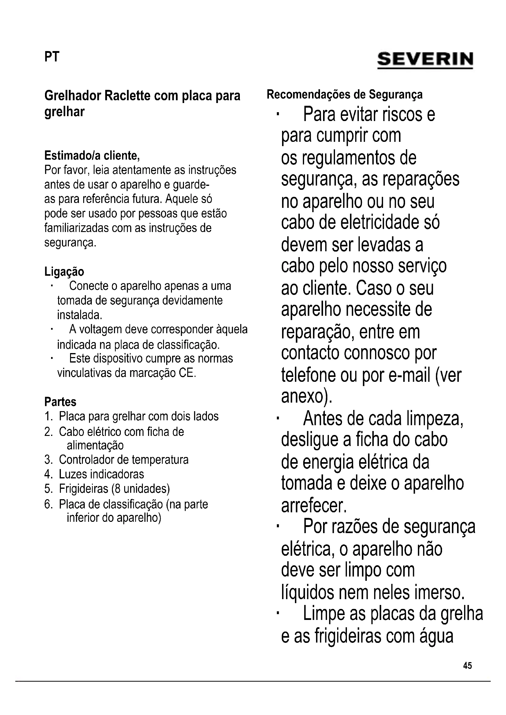 Grelhador Raclette com placa para grelhar Estimado/a cliente, Por favor, leia atentamente as instruções antes de usar o aparelho e guarde- as para referência futura. Aquele só pode ser usado por pessoas que estão familiarizadas com as instruções de segurança. Ligação ∙ Conecte o aparelho apenas a uma tomada de segurança devidamente instalada. ∙ A voltagem deve corresponder àquela indicada na placa de classicação. ∙ Este dispositivo cumpre as normas vinculativas da marcação CE. Partes