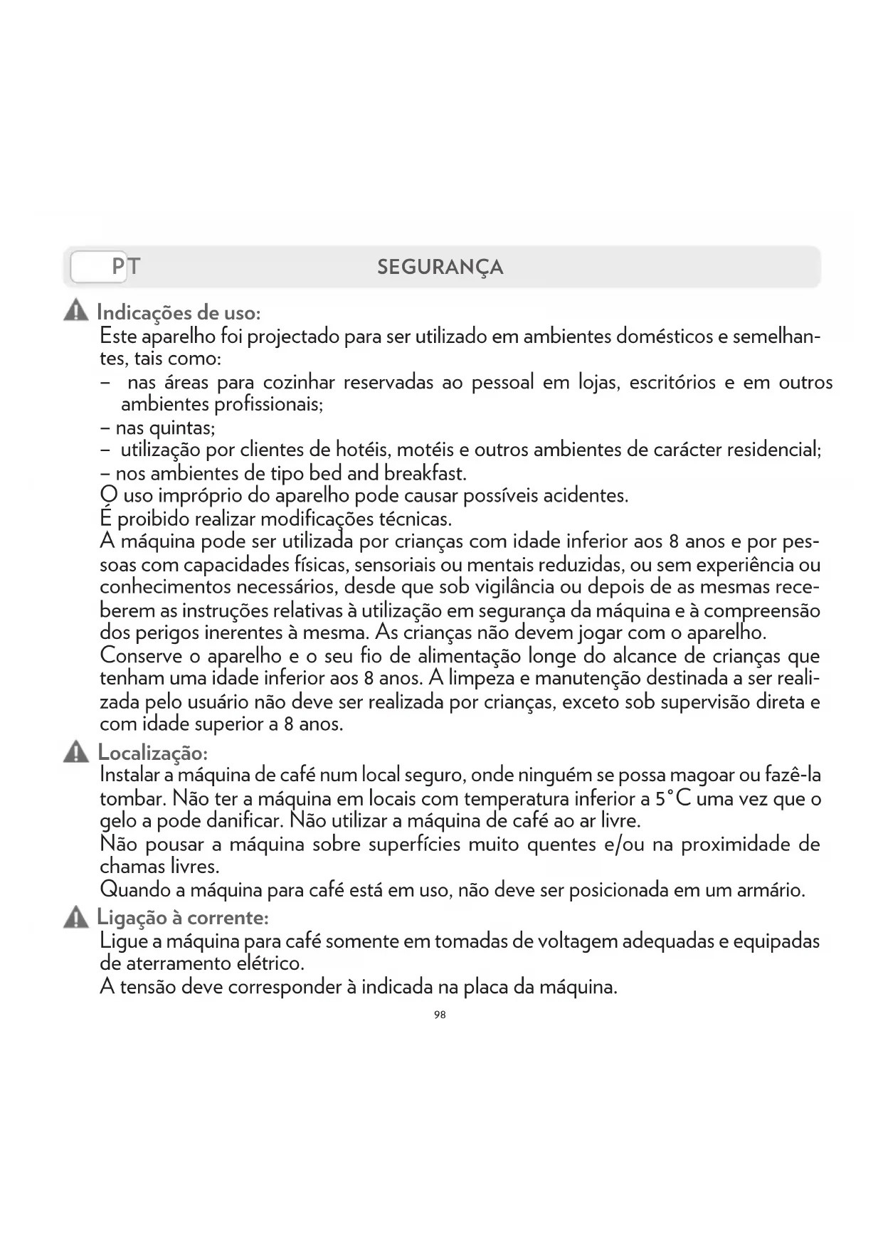 - Termofusible98 ITPT SEGURANÇA Indicações de uso: Este aparelho foi projectado para ser utilizado em ambientes domésticos e semelhan- tes, tais como: – nas áreas para cozinhar reservadas ao pessoal em lojas, escritórios e em outros ambientes profissionais; – nas quintas; – utilização por clientes de hotéis, motéis e outros ambientes de carácter residencial; – nos ambientes de tipo bed and breakfast. O uso impróprio do aparelho pode causar possíveis acidentes. É proibido realizar modificações técnicas. A máquina pode ser utilizada por crianças com idade inferior aos 8 anos e por pes- soas com capacidades físicas, sensoriais ou mentais reduzidas, ou sem experiência ou conhecimentos necessários, desde que sob vigilância ou depois de as mesmas rece- berem as instruções relativas à utilização em segurança da máquina e à compreensão dos perigos inerentes à mesma. As crianças não devem jogar com o aparelho. Conserve o aparelho e o seu fio de alimentação longe do alcance de crianças que tenham uma idade inferior aos 8 anos. A limpeza e manutenção destinada a ser reali- zada pelo usuário não deve ser realizada por crianças, exceto sob supervisão direta e com idade superior a 8 anos. Localização: Instalar a máquina de café num local seguro, onde ninguém se possa magoar ou fazê-la tombar. Não ter a máquina em locais com temperatura inferior a 5°C uma vez que o gelo a pode danificar. Não utilizar a máquina de café ao ar livre. Não pousar a máquina sobre superfícies muito quentes e/ou na proximidade de chamas livres. Quando a máquina para café está em uso, não deve ser posicionada em um armário. Ligação à corrente: Ligue a máquina para café somente em tomadas de voltagem adequadas e equipadas de aterramento elétrico. A tensão deve corresponder à indicada na placa da máquina.99