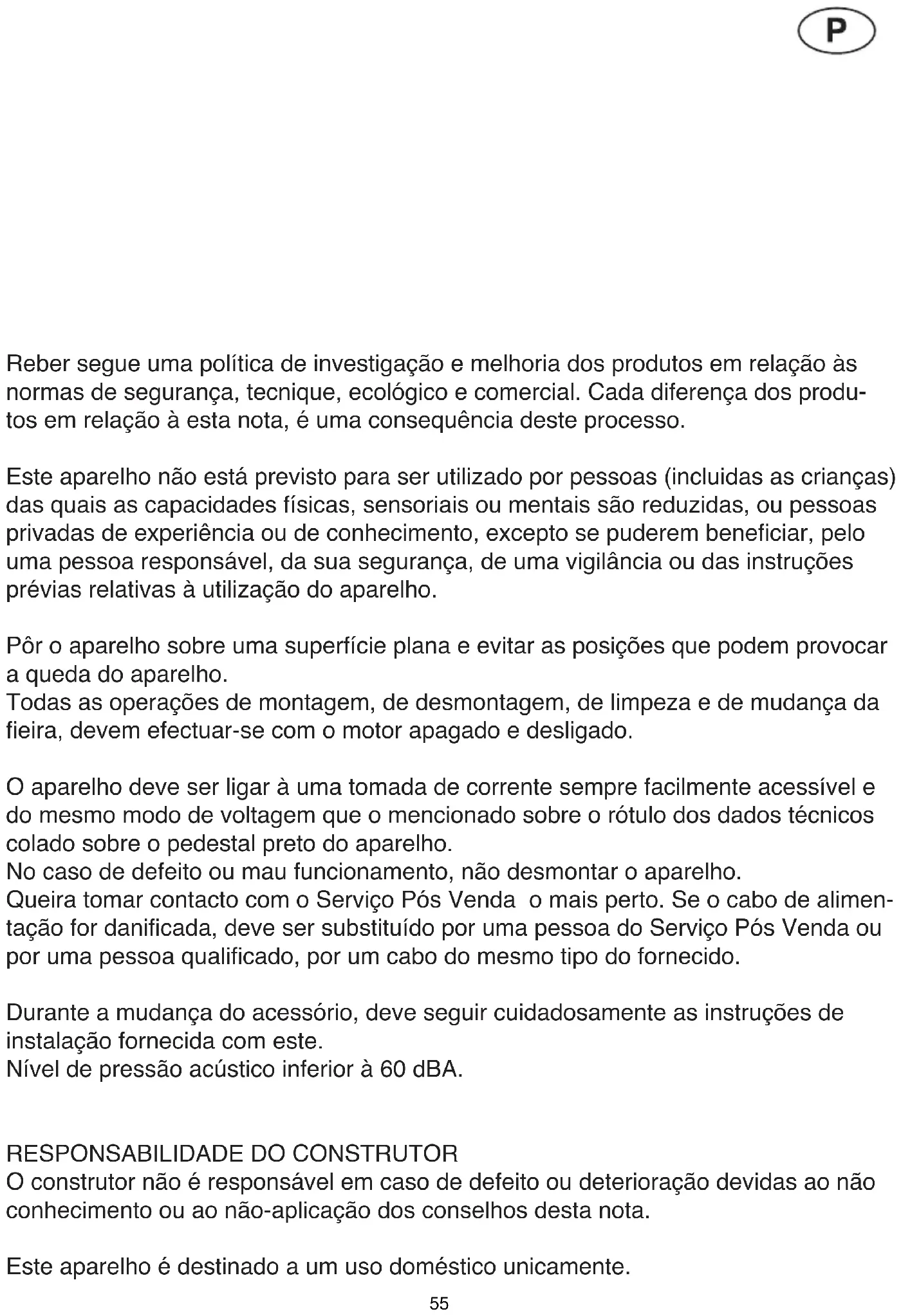 de la presión con la cual sale; más claro si la presión queda escasa (alimentación demasiado escasa para la cantidad de pasta en salida) o menos clara con la buena presión de trabajo de la máquina; el color no modica la calidad y las características de la pasta − En caso de bloqueo de la máquina apagar y desconectar inmediatamente el motor. 54Reber segue uma política de investigação e melhoria dos produtos em relação às normas de segurança, tecnique, ecológico e comercial. Cada diferença dos produ- tos em relação à esta nota, é uma consequência deste processo. Este aparelho não está previsto para ser utilizado por pessoas (incluidas as crianças) das quais as capacidades físicas, sensoriais ou mentais são reduzidas, ou pessoas privadas de experiência ou de conhecimento, excepto se puderem beneciar, pelo uma pessoa responsável, da sua segurança, de uma vigilância ou das instruções prévias relativas à utilização do aparelho. Pôr o aparelho sobre uma superfície plana e evitar as posições que podem provocar a queda do aparelho. Todas as operações de montagem, de desmontagem, de limpeza e de mudança da eira, devem efectuar-se com o motor apagado e desligado. O aparelho deve ser ligar à uma tomada de corrente sempre facilmente acessível e do mesmo modo de voltagem que o mencionado sobre o rótulo dos dados técnicos colado sobre o pedestal preto do aparelho. No caso de defeito ou mau funcionamento, não desmontar o aparelho. Queira tomar contacto com o Serviço Pós Venda o mais perto. Se o cabo de alimen- tação for danicada, deve ser substituído por uma pessoa do Serviço Pós Venda ou por uma pessoa qualicado, por um cabo do mesmo tipo do fornecido. Durante a mudança do acessório, deve seguir cuidadosamente as instruções de instalação fornecida com este. Nível de pressão acústico inferior à 60 dBA.