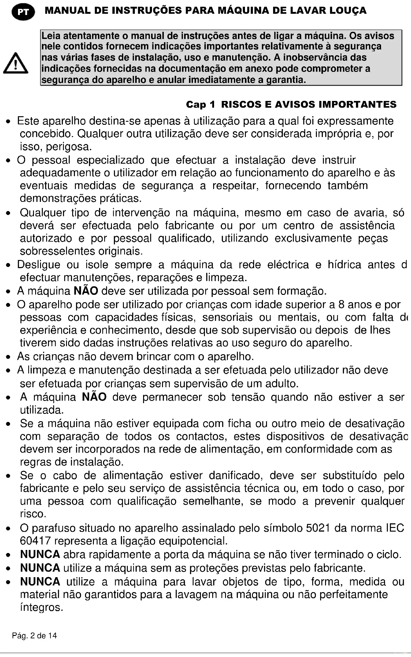 Leia atentamente o manual de instruções antes de ligar a máquina. Os avisos nele contidos fornecem indicações importantes relativamente à segurança nas várias fases de instalação, uso e manutenção. A inobservância das indicações fornecidas na documentação em anexo pode comprometer a segurança do aparelho e anular imediatamente a garantia. Cap 1 RISCOS E AVISOS IMPORTANTES Este aparelho destina-se apenas à utilização para a qual foi expressamente concebido. Qualquer outra utilização deve ser considerada imprópria e, por isso, perigosa. O pessoal especializado que efectuar a instalação deve instruir adequadamente o utilizador em relação ao funcionamento do aparelho e às eventuais medidas de segurança a respeitar, fornecendo também demonstrações práticas. Qualquer tipo de intervenção na máquina, mesmo em caso de avaria, só deverá ser efectuada pelo fabricante ou por um centro de assistência autorizado e por pessoal qualificado, utilizando exclusivamente peças sobresselentes originais. Desligue ou isole sempre a máquina da rede eléctrica e hídrica antes de efectuar manutenções, reparações e limpeza. A máquina NÃO deve ser utilizada por pessoal sem formação. O aparelho pode ser utilizado por crianças com idade superior a 8 anos e por pessoas com capacidades físicas, sensoriais ou mentais, ou com falta de experiência e conhecimento, desde que sob supervisão ou depois de lhes tiverem sido dadas instruções relativas ao uso seguro do aparelho. As crianças não devem brincar com o aparelho. A limpeza e manutenção destinada a ser efetuada pelo utilizador não deve ser efetuada por crianças sem supervisão de um adulto. A máquina NÃO deve permanecer sob tensão quando não estiver a ser utilizada. Se a máquina não estiver equipada com ficha ou outro meio de desativação com separação de todos os contactos, estes dispositivos de desativação devem ser incorporados na rede de alimentação, em conformidade com as regras de instalação. Se o cabo de alimentação estiver danificado, deve ser substituído pelo fabricante e pelo seu serviço de assistência técnica ou, em todo o caso, por uma pessoa com qualificação semelhante, se modo a prevenir qualquer risco. O parafuso situado no aparelho assinalado pelo símbolo 5021 da norma IEC 60417 representa a ligação equipotencial. NUNCA abra rapidamente a porta da máquina se não tiver terminado o ciclo. NUNCA utilize a máquina sem as proteções previstas pelo fabricante. NUNCA utilize a máquina para lavar objetos de tipo, forma, medida ou material não garantidos para a lavagem na máquina ou não perfeitamente íntegros.MANUAL DE INSTRUÇÕES PARA MÁQUINA DE LAVAR LOUÇA Pág. 3 de 14