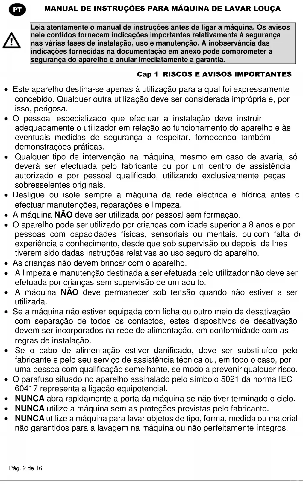 Leia atentamente o manual de instruções antes de ligar a máquina. Os avisos nele contidos fornecem indicações importantes relativamente à segurança nas várias fases de instalação, uso e manutenção. A inobservância das indicações fornecidas na documentação em anexo pode comprometer a segurança do aparelho e anular imediatamente a garantia. Cap 1 RISCOS E AVISOS IMPORTANTES Este aparelho destina-se apenas à utilização para a qual foi expressamente concebido. Qualquer outra utilização deve ser considerada imprópria e, por isso, perigosa. O pessoal especializado que efectuar a instalação deve instruir adequadamente o utilizador em relação ao funcionamento do aparelho e às eventuais medidas de segurança a respeitar, fornecendo também demonstrações práticas. Qualquer tipo de intervenção na máquina, mesmo em caso de avaria, só deverá ser efectuada pelo fabricante ou por um centro de assistência autorizado e por pessoal qualificado, utilizando exclusivamente peças sobresselentes originais. Desligue ou isole sempre a máquina da rede eléctrica e hídrica antes de efectuar manutenções, reparações e limpeza. A máquina NÃO deve ser utilizada por pessoal sem formação. O aparelho pode ser utilizado por crianças com idade superior a 8 anos e por pessoas com capacidades físicas, sensoriais ou mentais, ou com falta de experiência e conhecimento, desde que sob supervisão ou depois de lhes tiverem sido dadas instruções relativas ao uso seguro do aparelho. As crianças não devem brincar com o aparelho. A limpeza e manutenção destinada a ser efetuada pelo utilizador não deve ser efetuada por crianças sem supervisão de um adulto. A máquina NÃO deve permanecer sob tensão quando não estiver a ser utilizada. Se a máquina não estiver equipada com ficha ou outro meio de desativação com separação de todos os contactos, estes dispositivos de desativação devem ser incorporados na rede de alimentação, em conformidade com as regras de instalação. Se o cabo de alimentação estiver danificado, deve ser substituído pelo fabricante e pelo seu serviço de assistência técnica ou, em todo o caso, por uma pessoa com qualificação semelhante, se modo a prevenir qualquer risco. O parafuso situado no aparelho assinalado pelo símbolo 5021 da norma IEC 60417 representa a ligação equipotencial. NUNCA abra rapidamente a porta da máquina se não tiver terminado o ciclo. NUNCA utilize a máquina sem as proteções previstas pelo fabricante. NUNCA utilize a máquina para lavar objetos de tipo, forma, medida ou material não garantidos para a lavagem na máquina ou não perfeitamente íntegros.MANUAL DE INSTRUÇÕES PARA MÁQUINA DE LAVAR LOUÇA Pàg. 3 de 16