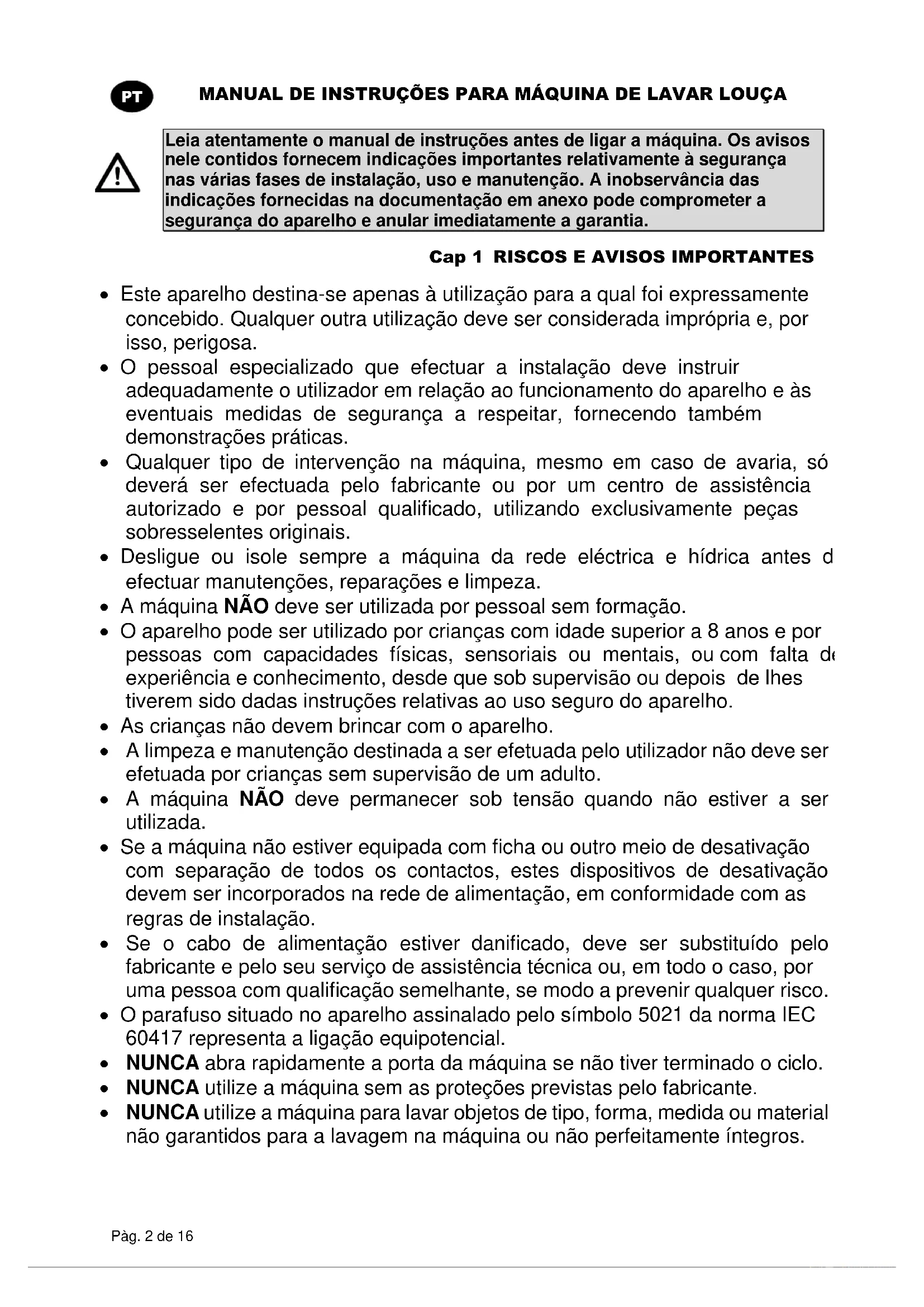 Leia atentamente o manual de instruções antes de ligar a máquina. Os avisos nele contidos fornecem indicações importantes relativamente à segurança nas várias fases de instalação, uso e manutenção. A inobservância das indicações fornecidas na documentação em anexo pode comprometer a segurança do aparelho e anular imediatamente a garantia. Cap 1 RISCOS E AVISOS IMPORTANTES Este aparelho destina-se apenas à utilização para a qual foi expressamente concebido. Qualquer outra utilização deve ser considerada imprópria e, por isso, perigosa. O pessoal especializado que efectuar a instalação deve instruir adequadamente o utilizador em relação ao funcionamento do aparelho e às eventuais medidas de segurança a respeitar, fornecendo também demonstrações práticas. Qualquer tipo de intervenção na máquina, mesmo em caso de avaria, só deverá ser efectuada pelo fabricante ou por um centro de assistência autorizado e por pessoal qualificado, utilizando exclusivamente peças sobresselentes originais. Desligue ou isole sempre a máquina da rede eléctrica e hídrica antes de efectuar manutenções, reparações e limpeza. A máquina NÃO deve ser utilizada por pessoal sem formação. O aparelho pode ser utilizado por crianças com idade superior a 8 anos e por pessoas com capacidades físicas, sensoriais ou mentais, ou com falta de experiência e conhecimento, desde que sob supervisão ou depois de lhes tiverem sido dadas instruções relativas ao uso seguro do aparelho. As crianças não devem brincar com o aparelho. A limpeza e manutenção destinada a ser efetuada pelo utilizador não deve ser efetuada por crianças sem supervisão de um adulto. A máquina NÃO deve permanecer sob tensão quando não estiver a ser utilizada. Se a máquina não estiver equipada com ficha ou outro meio de desativação com separação de todos os contactos, estes dispositivos de desativação devem ser incorporados na rede de alimentação, em conformidade com as regras de instalação. Se o cabo de alimentação estiver danificado, deve ser substituído pelo fabricante e pelo seu serviço de assistência técnica ou, em todo o caso, por uma pessoa com qualificação semelhante, se modo a prevenir qualquer risco. O parafuso situado no aparelho assinalado pelo símbolo 5021 da norma IEC 60417 representa a ligação equipotencial. NUNCA abra rapidamente a porta da máquina se não tiver terminado o ciclo. NUNCA utilize a máquina sem as proteções previstas pelo fabricante. NUNCA utilize a máquina para lavar objetos de tipo, forma, medida ou material não garantidos para a lavagem na máquina ou não perfeitamente íntegros.MANUAL DE INSTRUÇÕES PARA MÁQUINA DE LAVAR LOUÇA Pàg. 3 de 16