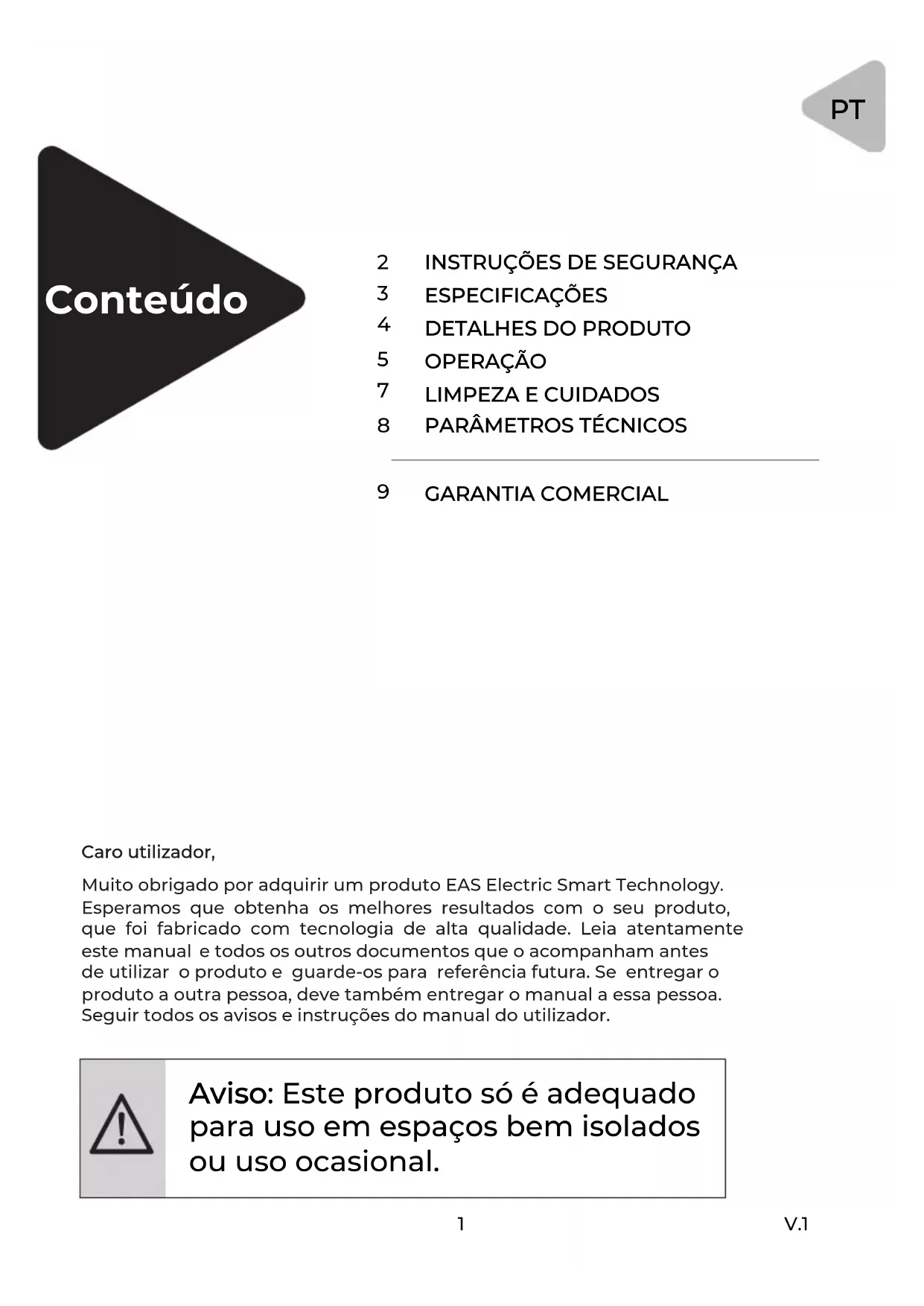Caro utilizador, Muito obrigado por adquirir um produto EAS Electric Smart Technology. Esperamos que obtenha os melhores resultados com o seu produto, que foi fabricado com tecnologia de alta qualidade. Leia atentamente este manual e todos os outros documentos que o acompanham antes de utilizar o produto e guarde-os para referência futura. Se entregar o produto a outra pessoa, deve também entregar o manual a essa pessoa. Seguir todos os avisos e instruções do manual do utilizador. Aviso: Este produto só é adequado para uso em espaços bem isolados ou uso ocasional.