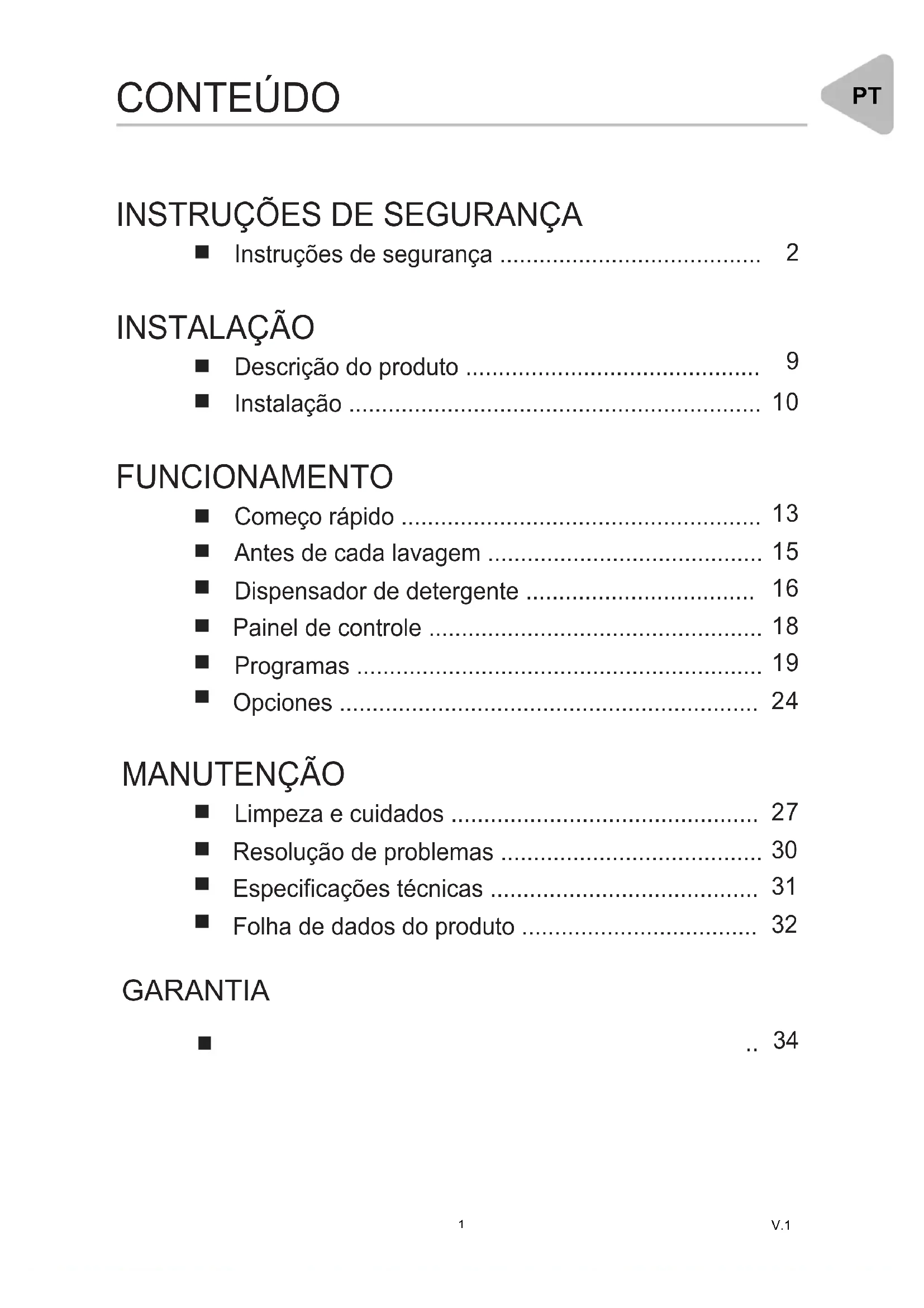 Instruções de segurança ........................................ INSTALAÇÃO Descrição do produto ............................................. Instalação ............................................................... FUNCIONAMENTO Começo rápido ....................................................... Antes de cada lavagem .......................................... Dispensador de detergente ................................... Painel de controle ................................................... Programas .............................................................. Opciones ................................................................ MANUTENÇÃO Limpeza e cuidados ............................................... Resolução de problemas ........................................ Especificações técnicas ......................................... Folha de dados do produto .................................... GARANTIA Garantia comercial .............................................