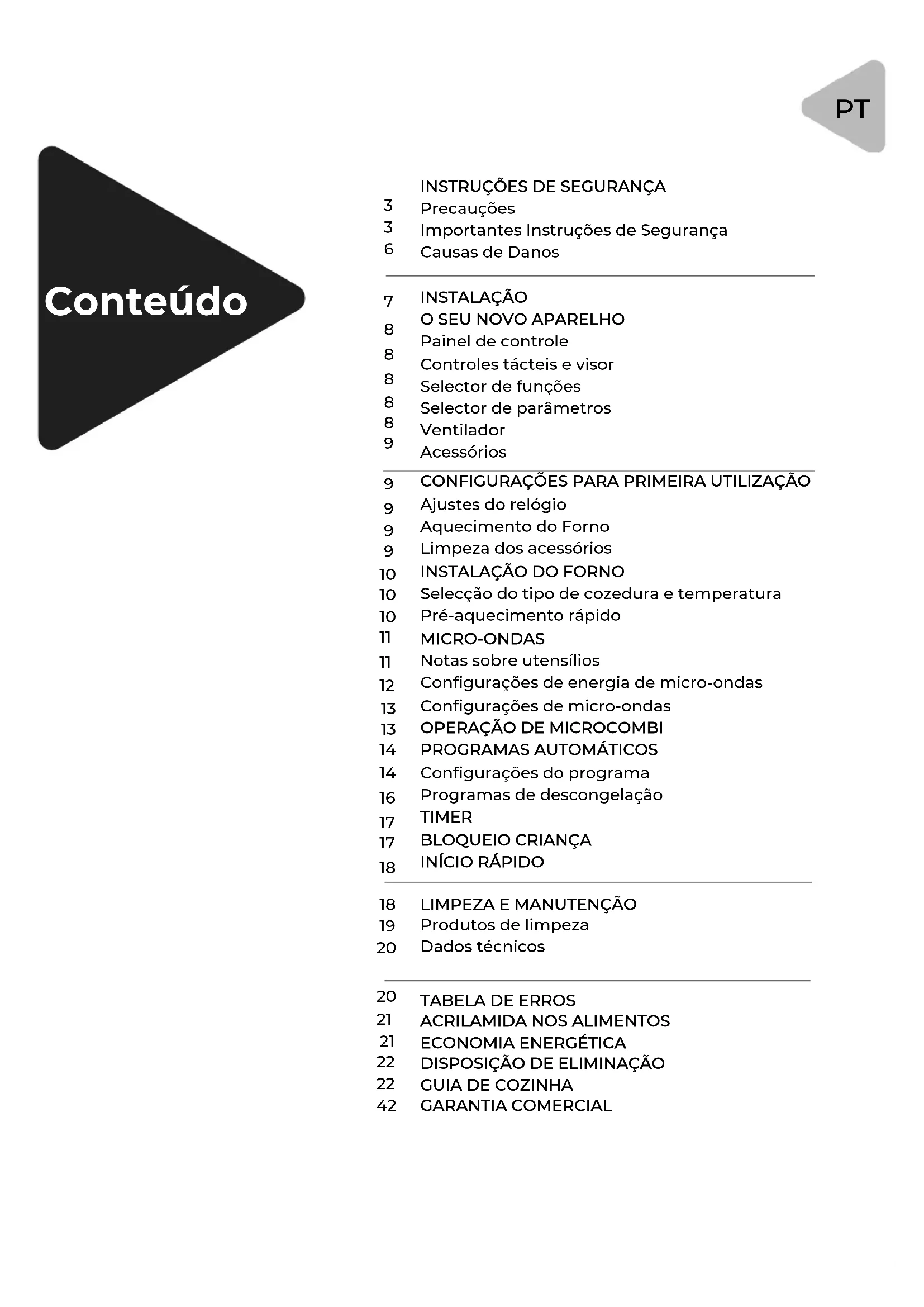 V.2Se o seu forno permitir a utilização de um termómetro, utilize apenas o recomendado para o seu modelo. Os fornos de microondas não devem ser embutidos ou colocados dentro de um armário, a menos que tenham sido fabricados e testados para esse fim. Se assim for, a porta decorativa do armário deve ser mantida aberta durante o funcionamento do forno. Este aparelho é um aparelho de mesa autónomo e não foi concebido para ser incorporado. A parte de trás do aparelho deve ser colocada contra uma parede. Este aparelho destina-se à utilização em ambientes domés- ticos e similares, tais como cozinhas de pessoal em lojas, escritórios e outros ambientes de trabalho, em casas de campo, ou por hóspedes em hotéis, motéis e outros tipos de alojamento residencial, tais como pousadas e pequenos- almoços. O forno de microondas destina-se ao aquecimento de ali- mentos e bebidas. A utilização para secar alimentos ou vestuário ou para aquecer almofadas, chinelos ou meias, panos de lavagem húmidos, ou outros artigos, pode resultar em risco de ferimentos ou incêndio. Não utilizar recipientes ou utensílios metálicos para aqueci- mento por microondas. Não limpar o aparelho com um aparelho de limpeza a vapor. Não utilizar produtos de limpeza abrasivos ou raspadores de metal para limpar o vidro da porta, pois podem riscar a superfície e isto pode causar a quebra do vidro. AVISO: As partes acessíveis podem ficar quentes durante a utilização. Manter o aparelho fora do alcance das crianças, e ter o cuidado de não tocar nos elementos de aquecimento. LEIA CUIDADOSAMENTE TODAS ESTAS INSTRUÇÕES E GUARDE-AS PARA REFERÊNCIA FUTURA.