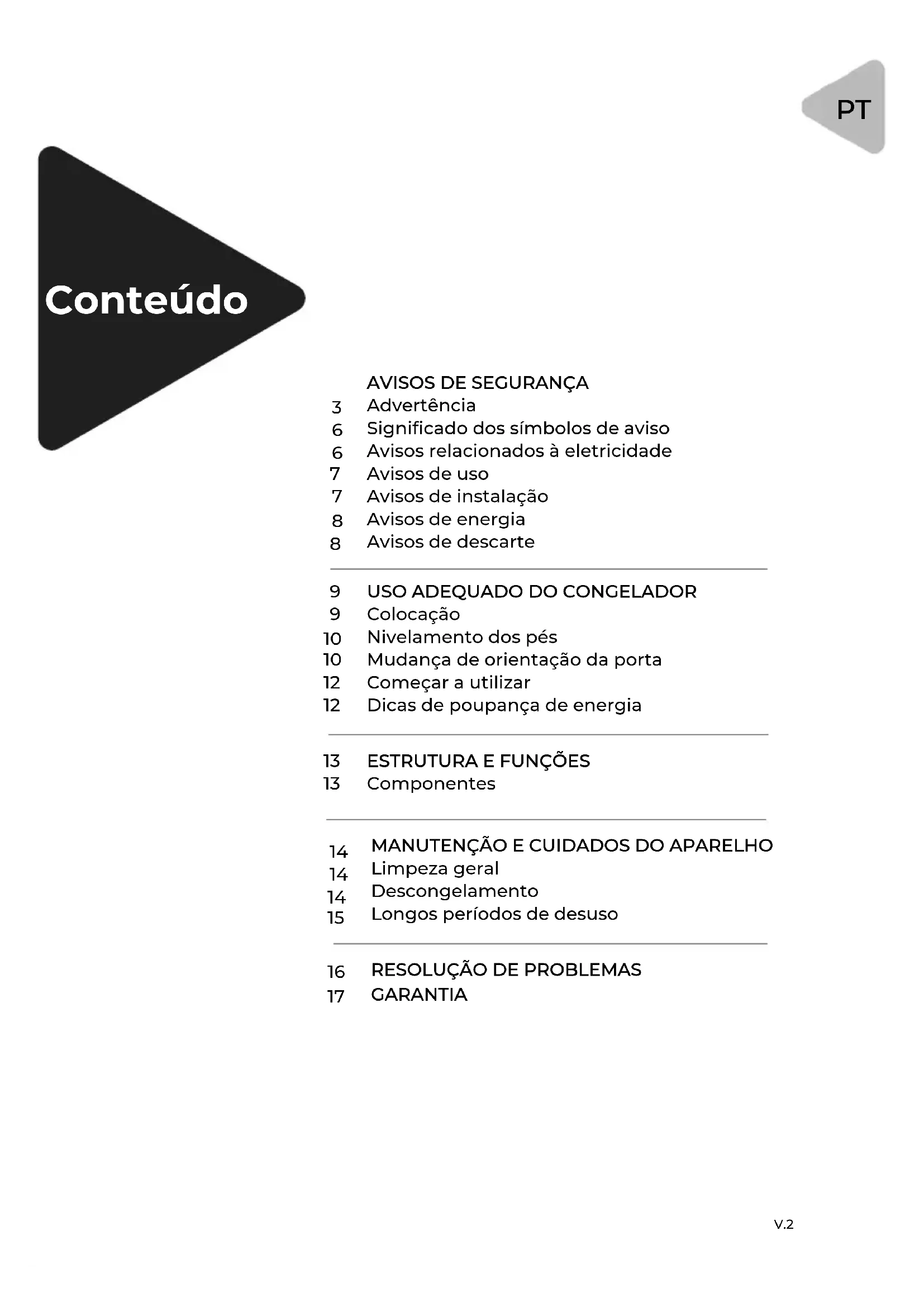 Não puxar o cabo de alimentação para desligar o congelador. Segurar firmemente a ficha e puxá-la directamente para fora da tomada. Para garantir uma utilização segura, ter cuidado para que o cordão não seja danificado, e não utilizar cordões gastos ou danificados. Utilizar uma tomada eléctrica dedicada que não seja partilhada com outros aparelhos eléctricos. A ficha deve ter um contacto firme com a tomada ou pode resultar em incêndio. Verificar se a ligação à terra está ligada de forma fiável. Se houver fuga de refrigerante ou outros gases inflamáveis, fechar a válvula com fugas e abrir portas e janelas. Não desligar o frigorífico ou outros aparelhos eléctricos, uma vez que as faíscas podem causar um incêndio. Não colocar outros aparelhos eléctricos em cima do con- gelador, a menos que sejam produtos seguros especi- ficados pelo fabricante.V.2