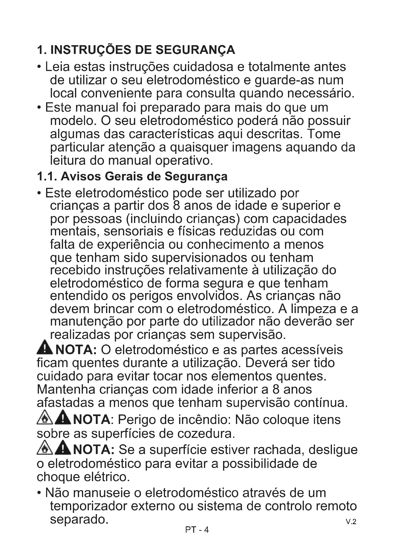 - Este eletrodoméstico pode ser utilizado por crianças a partir dos 8 anos de idade e superior e por pessoas (incluindo crianças) com capacidades mentais, sensoriais e físicas reduzidas ou com falta de experiência ou conhecimento a menos que tenham sido supervisionados ou tenham recebido instruções relativamente à utilização do eletrodoméstico de forma segura e que tenham entendido os perigos envolvidos. As crianças não devem brincar com o eletrodoméstico. A limpeza e a manutenção por parte do utilizador não deverão ser realizadas por crianças sem supervisão. NOTA: O eletrodoméstico e as partes acessíveis ficam quentes durante a utilização. Deverá ser tido cuidado para evitar tocar nos elementos quentes. Mantenha crianças com idade inferior a 8 anos afastadas a menos que tenham supervisão contínua. NOTA: Perigo de incêndio: Não coloque itens sobre as superfícies de cozedura. NOTA: Se a superfície estiver rachada, desligue o eletrodoméstico para evitar a possibilidade de choque elétrico.