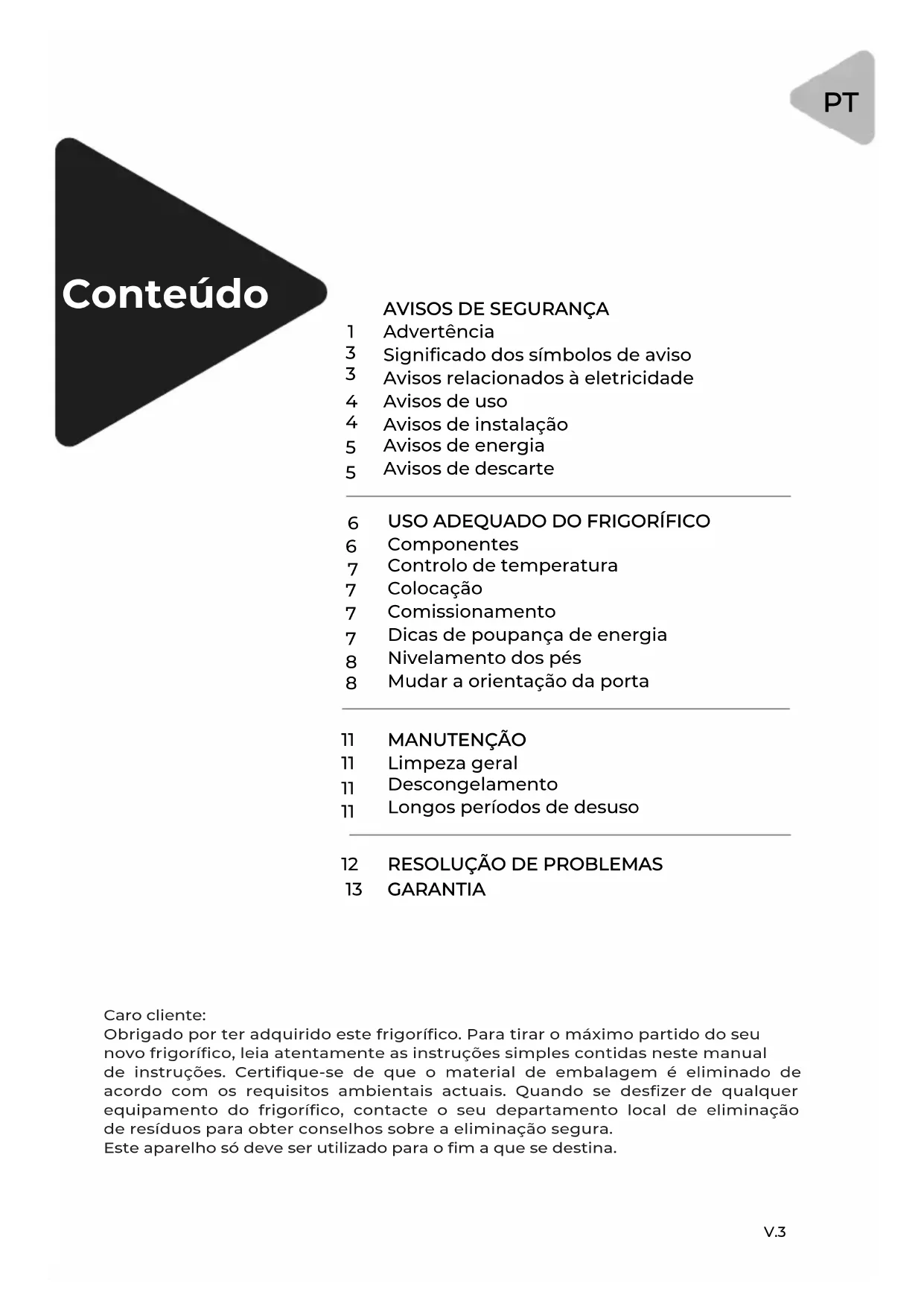 Advertência Significado dos símbolos de aviso Avisos relacionados à eletricidade Avisos de uso Avisos de instalação Avisos de energia Avisos de descarte MANUTENÇÃO Limpeza geral Descongelamento Longos períodos de desuso