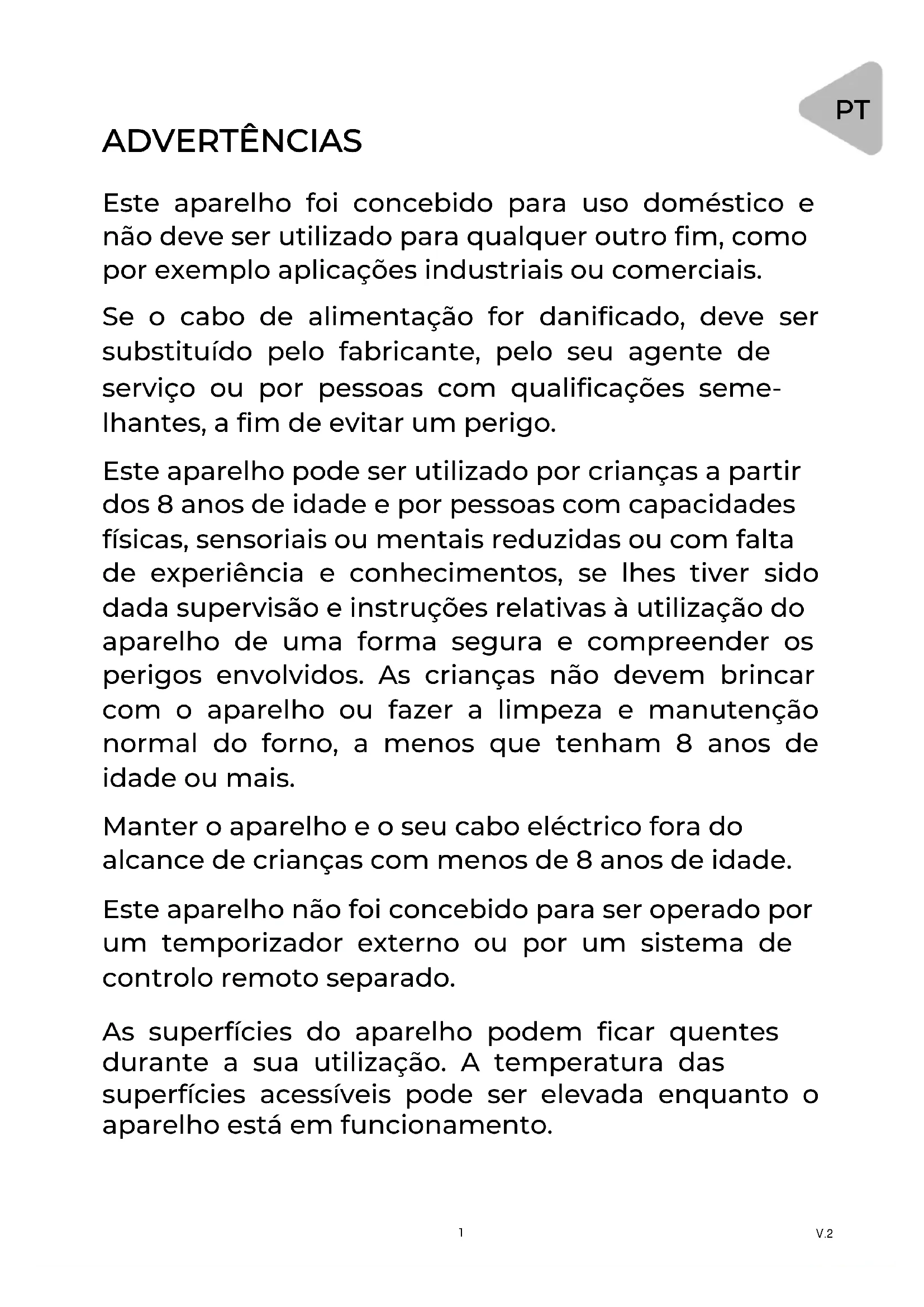 Este aparelho foi concebido para uso doméstico e não deve ser utilizado para qualquer outro fim, como por exemplo aplicações industriais ou comerciais. Se o cabo de alimentação for danificado, deve ser substituído pelo fabricante, pelo seu agente de serviço ou por pessoas com qualificações seme- lhantes, a fim de evitar um perigo. Este aparelho pode ser utilizado por crianças a partir dos 8 anos de idade e por pessoas com capacidades físicas, sensoriais ou mentais reduzidas ou com falta de experiência e conhecimentos, se lhes tiver sido dada supervisão e instruções relativas à utilização do aparelho de uma forma segura e compreender os perigos envolvidos. As crianças não devem brincar com o aparelho ou fazer a limpeza e manutenção normal do forno, a menos que tenham 8 anos de idade ou mais. Manter o aparelho e o seu cabo eléctrico fora do alcance de crianças com menos de 8 anos de idade. Este aparelho não foi concebido para ser operado por um temporizador externo ou por um sistema de controlo remoto separado. As superfícies do aparelho podem ficar quentes durante a sua utilização. A temperatura das superfícies acessíveis pode ser elevada enquanto o aparelho está em funcionamento.