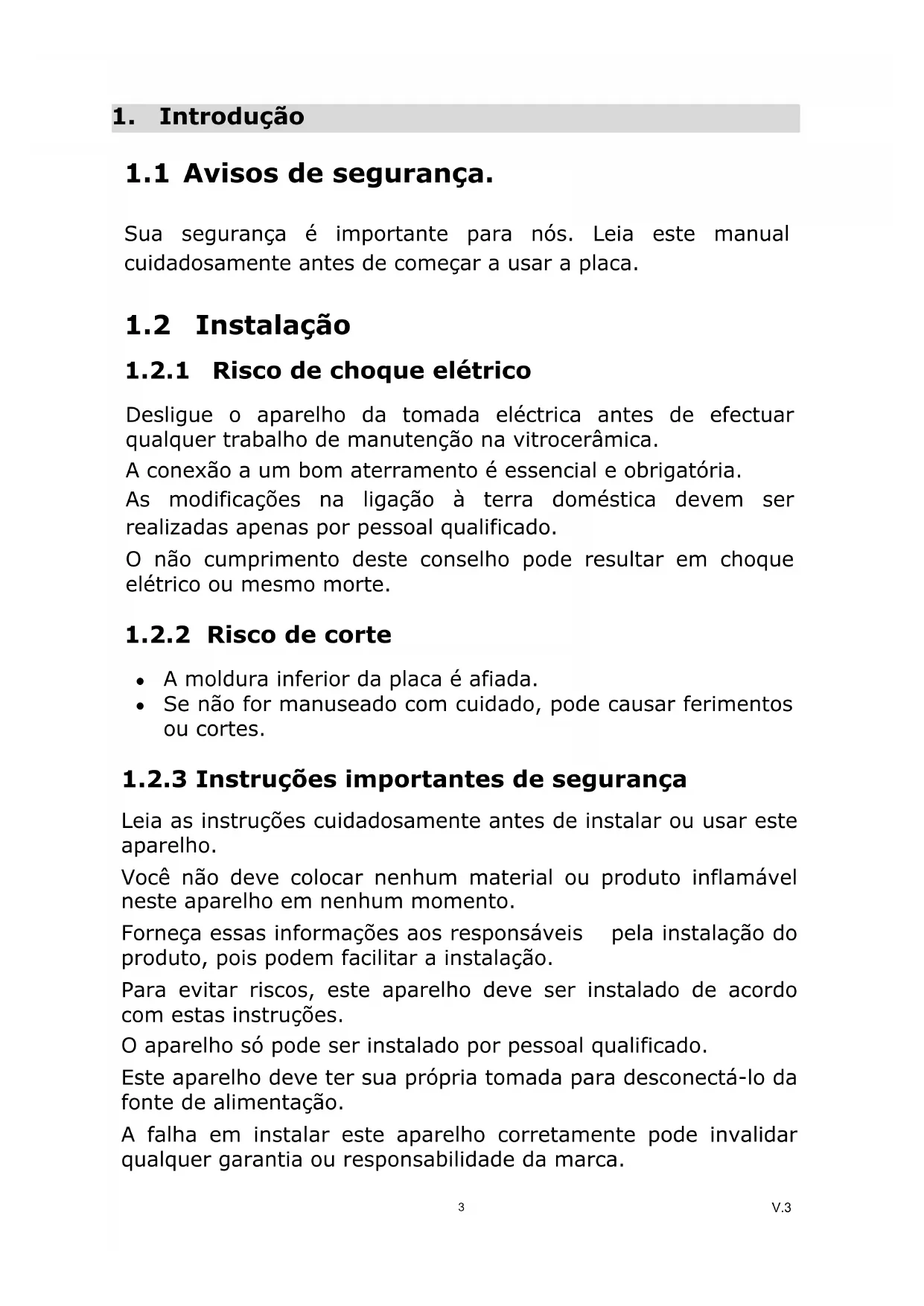V.3ambientes de trabalho, casas de campo, por clientes em hotéis, motéis e outros ambientes residenciais. AVISO: O aparelho e suas partes acessíveis começam a aquecer durante o uso. Evite tocar nos botões de controle se eles estiverem quentes. Crianças menores de 8 anos devem ser mantidas longe do aparelho, a menos que sejam supervisionadas. Este aparelho pode ser utilizado por crianças com idade igual ou superior a 8 anos ou por pessoas com capacidades físicas, sensoriais ou mentais reduzidas, desde que estejam sob supervisão e tenham conhecimentos para o utilizar da forma adequada, além de compreenderem os perigos que a sua utilização acarreta. As crianças não devem brincar com o aparelho. Nenhuma criança deve realizar sua limpeza e manutenção sem supervisão. AVISO: Cozinhar sem supervisão em uma placa com óleo pode ser perigoso e pode causar incêndio. NUNCA tente extinguir o fogo com água. AVISO: Risco de incêndio - Não coloque nada na superfície da vitrocerâmica. AVISO: Se a superfície estiver quebrada, desligue o aparelho para evitar a possibilidade de choque elétrico. Não use aparelhos a vapor para limpar. Nunca use este aparelho para aquecer o ambiente. PARABÉNS pela aquisição da sua nova placa de cerâmica. Recomendamos que você gaste seu tempo lendo estas instruções para entender como instalá-lo corretamente. Para obter as diretrizes de instalação, leia a seção de instalação. Leia todas as instruções de segurança antes de usar o fogão e guarde-as para referência futura.