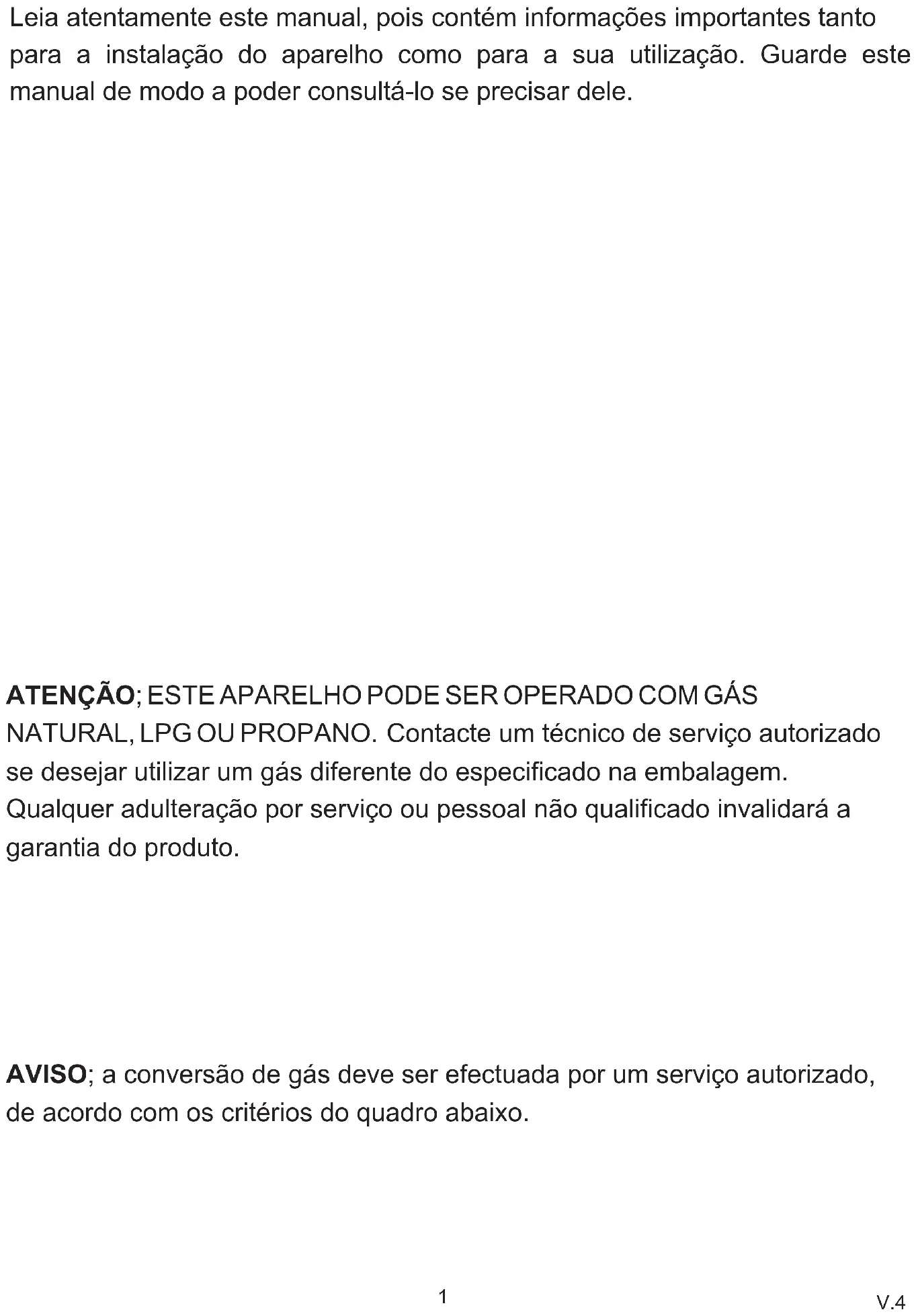 94Leia atentamente este manual, pois contém informações importantes tanto para a instalação do aparelho como para a sua utilização. Guarde este manual de modo a poder consultá-lo se precisar dele. ATENÇÃO; ESTE APARELHO PODE SER OPERADO COM GÁS NATURAL, LPG OU PROPANO. Contacte um técnico de serviço autorizado se desejar utilizar um gás diferente do especificado na embalagem. Qualquer adulteração por serviço ou pessoal não qualificado invalidará a garantia do produto. AVISO; a conversão de gás deve ser efectuada por um serviço autorizado, de acordo com os critérios do quadro abaixo.