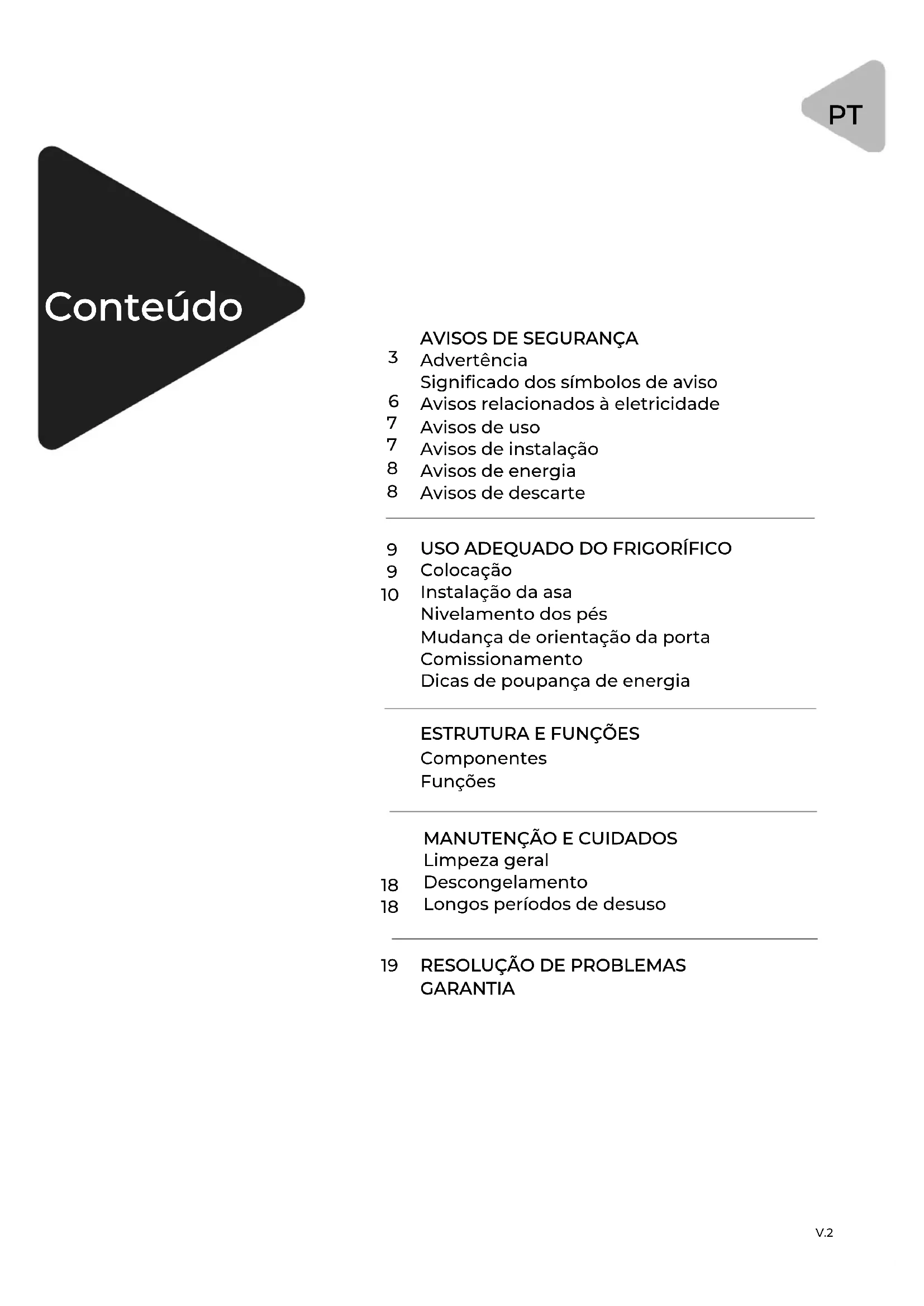 Aviso: Risco de incêndio / materiais inflamáveis. Este aparelho destina-se à utilização em ambientes domésticos e similares, tais como áreas de cozinha do pessoal em lojas, ofices e outros ambientes de trabalho; casas de campo e por clientes em hotéis, motéis e outros ambientes do tipo residencial; ambientes do tipo bed & breakfast; catering e aplicações similares não retalhistas. Se o cabo de alimentação estiver danificado, deve ser substi- tuído pelo fabricante, seu agente de serviço ou pessoas igualmente qualificadas para evitar perigo. Não armazene substâncias explosivas, como latas de aerossol com propelente inflamável, neste aparelho. O aparelho deve ser desconectado após o uso e antes de fazer a manutenção do aparelho. ATENÇÃO: Evitar qualquer obstrução das aberturas de ventilação no interior da caixa do aparelho ou na estrutura incorporada. AVISO: Não utilizar dispositivos mecânicos ou outros meios para acelerar o processo de descongelamento para além dos recomendados pelo fabricante. AVISO: Não danificar o circuito do refrigerante. AVISO: Não utilizar aparelhos eléctricos dentro dos compar- timentos de armazenamento de alimentos do aparelho, a menos que sejam de um tipo recomendado pelo fabricante. AVISO: Eliminar o frigorífico de acordo com os regulamentos locais, uma vez que este utiliza gás refrigerante e inflamável. AVISO: Ao instalar o aparelho, certifique-se de que o cabo de alimentação não está preso ou danificado. V.24 AVISO: Não fixar tomadas eléctricas portáteis ou fontes de alimentação na parte de trás do dispositivo. Não utilizar extensões, cabos de extensão, ou adaptadores de dois pinos não ligados à terra para ligar o dispositivo. PERIGO: Há o risco de as crianças ficarem presas no seu interior. Antes de deitar fora o seu velho frigorífico ou congelador: -Retirar as portas. -Deixar as prateleiras no lugar para que as crianças não possam facilmente subir para dentro. O frigorífico deve ser desligado da corrente eléctrica antes de instalar quaisquer acessórios. O material de espuma refrigerante e ciclopentano utilizado para o refrigerador é inflamável. Por conseguinte, ao eliminar o frigorífico, este deve ser mantido afastado de qualquer fonte de incêndio e ser recuperado por uma empresa especializada com o adequado qualification, e nunca deve ser eliminado por combustão, a fim de evitar danos para o ambiente ou qualquer outro risco. Norma EN: Este aparelho pode ser utilizado por crianças a partir dos 8 anos de idade e por pessoas com capacidades físicas, sensoriais ou mentais reduzidas ou com falta de experiência e conhecimentos, se lhes tiver sido dada supervisão ou instruções relativas à utilização do aparelho de uma forma segura e compreender os perigos envolvidos. As crianças não devem brincar com o aparelho. A limpeza e a manutenção do utilizador não devem ser feitas por crianças sem supervisão. As crianças dos 3 aos 8 anos de idade podem carregar e descarregar aparelhos de refrigeração. Para a norma IEC: Este aparelho não se destina a ser utilizado por pessoas (incluindo crianças) com capacidades físicas, sensoriais ou mentais reduzidas, ou com falta de experiência e conhecimentos, a menos que tenham recebido supervisão ou instruções relativas à utilização do aparelho por uma pessoa responsável pela sua segurança. As crianças devem ser supervisionadas para garantir que não brincam com o aparelho. V.25 Notas 1, 2, 3, 4: Verifique se aplicável de acordo com o tipo de compartimento do seu produto. Para aparelhos com portas ou tampas com chave: mantenha as chaves fora do alcance das crianças e longe do frigorífico para evitar que as crianças fiquem presas no interior. Para aparelhos autónomos: estes aparelhos não são concebidos para serem utilizados como unidade incorporada. Qualquer substituição ou reparação de lâmpadas LED deve ser efectuada pelo fabricante, pelo seu serviço técnico ou por um profissional devidamente qualificado. Este produto contém uma fonte luminosa de classe de eficiência energética (G) Para evitar a contaminação ou desperdício de alimentos, observar as seguintes instruções: A abertura da porta por longos períodos de tempo pode causar um aumento significativo da temperatura nos compartimentos dos aparelhos. Superfícies regularmente limpas que podem entrar em contacto com alimentos e sistemas de drenagem acessíveis. Tanques de água limpa, se não tiverem sido utilizados durante 48 h; e sistemas de descarga ligados ao abaste- cimento de água, se não tiver sido extraída água durante 5 dias. (nota 1) Armazenar carne e peixe crus em recipientes adequados no frigorífico para que não entrem em contacto ou pinguem sobre outros alimentos. Os compartimentos de alimentos congelados de duas estrelas são adequados para armazenar alimentos pré- congelados, armazenar ou fazer gelados e fazer cubos de gelo. (nota 2) Os compartimentos de duas e três estrelas não são adequados para congelar alimentos frescos.(nota 3). Os aparelhos sem um compartimento de 4 estrelas não são adequados para congelar alimentos. (nota 4) Se o aparelho de refrigeração for deixado vazio durante um longo período de tempo, desligá-lo, descongelá-lo, limpá-lo, secá-lo, e deixar a porta aberta para evitar a formação de bolor e mofo no interior do aparelho. V.26