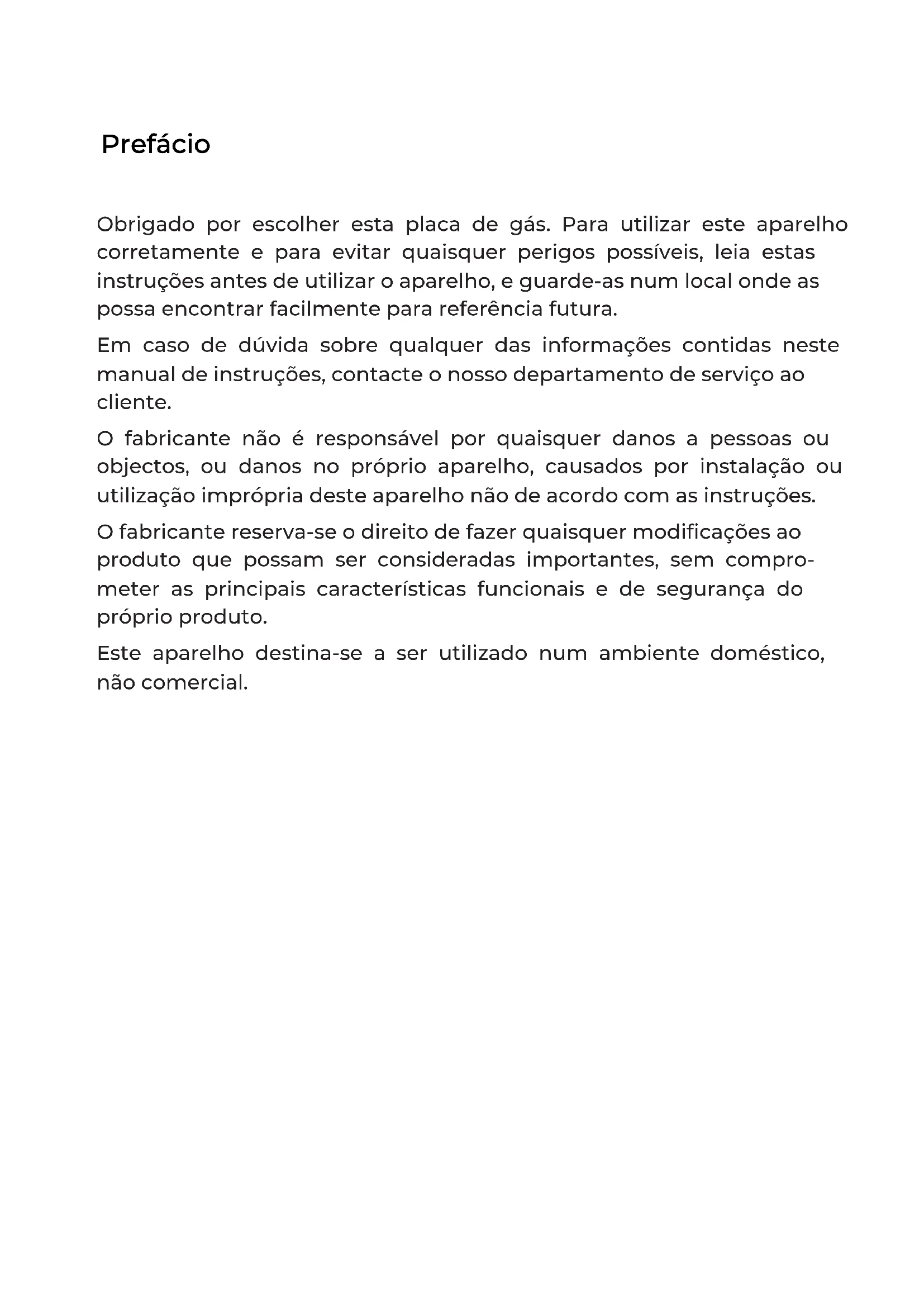 manifestations et grèves légales ou illégales; les faits relatifs aux actions des forces armées ou des forces de sécurité de l’État en temps de paix; conflits armés et actes de guerre (déclarés ou non); réaction nucléaire ou rayonnement ou contamination radioactive; vice ou défaut de la marchandise; faits qualifiés par le Gouvernement de la Nation de "catastrophe ou calamité nationale". La conception et les spécifications peuvent être modifiées sans préavis pour améliorer le produit. Toute modification du manuel sera mise à jour sur notre site web, vous pouvez vérifier la dernière version. V.6GGMCI-315 Prefácio Obrigado por escolher esta placa de gás. Para utilizar este aparelho corretamente e para evitar quaisquer perigos possíveis, leia estas instruções antes de utilizar o aparelho, e guarde-as num local onde as possa encontrar facilmente para referência futura. Em caso de dúvida sobre qualquer das informações contidas neste manual de instruções, contacte o nosso departamento de serviço ao cliente. O fabricante não é responsável por quaisquer danos a pessoas ou objectos, ou danos no próprio aparelho, causados por instalação ou utilização imprópria deste aparelho não de acordo com as instruções. O fabricante reserva-se o direito de fazer quaisquer modificações ao produto que possam ser consideradas importantes, sem compro- meter as principais características funcionais e de segurança do próprio produto. Este aparelho destina-se a ser utilizado num ambiente doméstico, não comercial. V.6Conteúdo