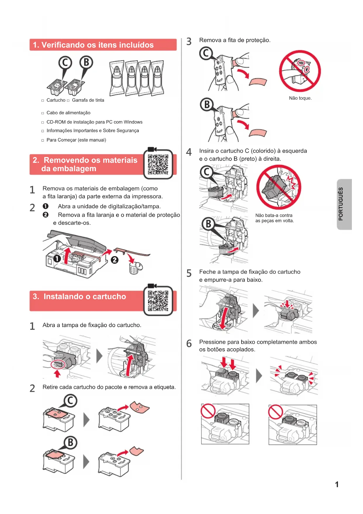 □ Informações Importantes e Sobre Segurança □ Cabo de alimentação □ CD-ROM de instalação para PC com Windows □ Para Começar )este manual( □ Cartucho □ Garrafa de tinta